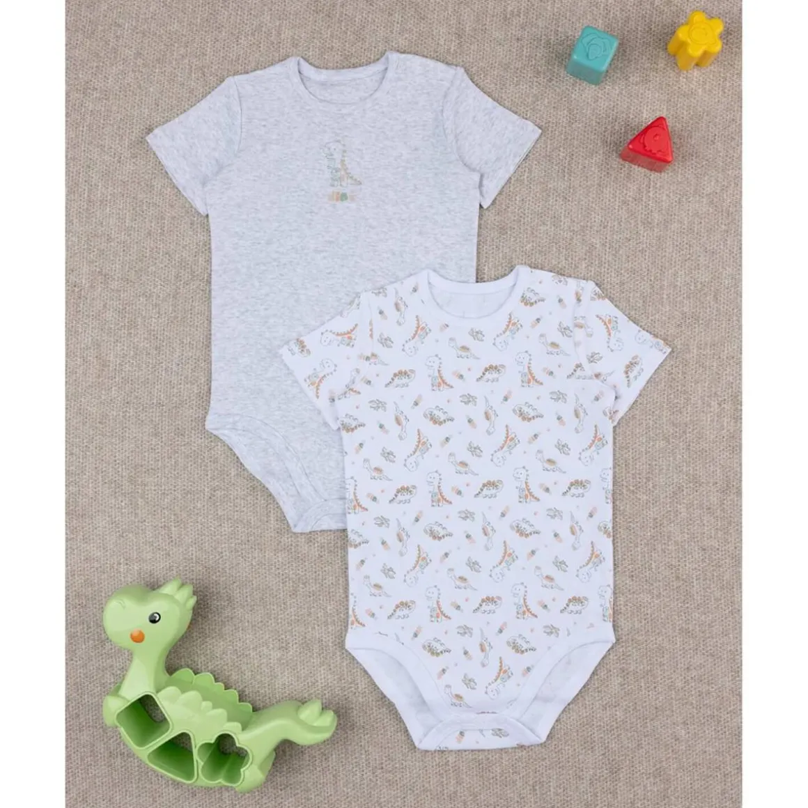 Pack básico de 2 bodies costina para niño. Las prendas se desarrollan sobre base blanca con estampado Dino en color coordinado. El ajuste es holgado y práctico gracias a botones automáticos en la entrepierna. La prenda es de algodón oeko-tex, probado para sustancias nocivas y garantiza alta seguridad. Accesorios no a la venta. El paquete contiene solo la prenda de vestir.