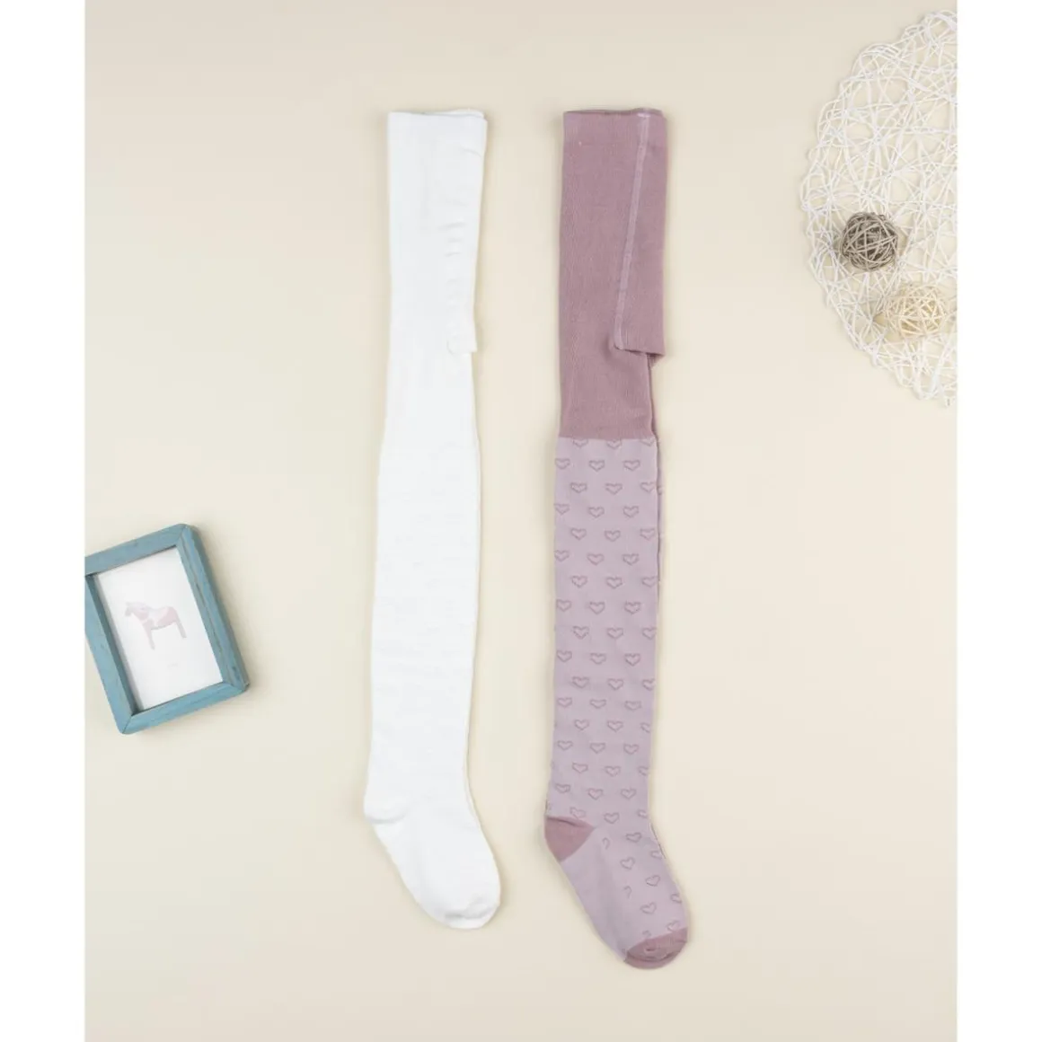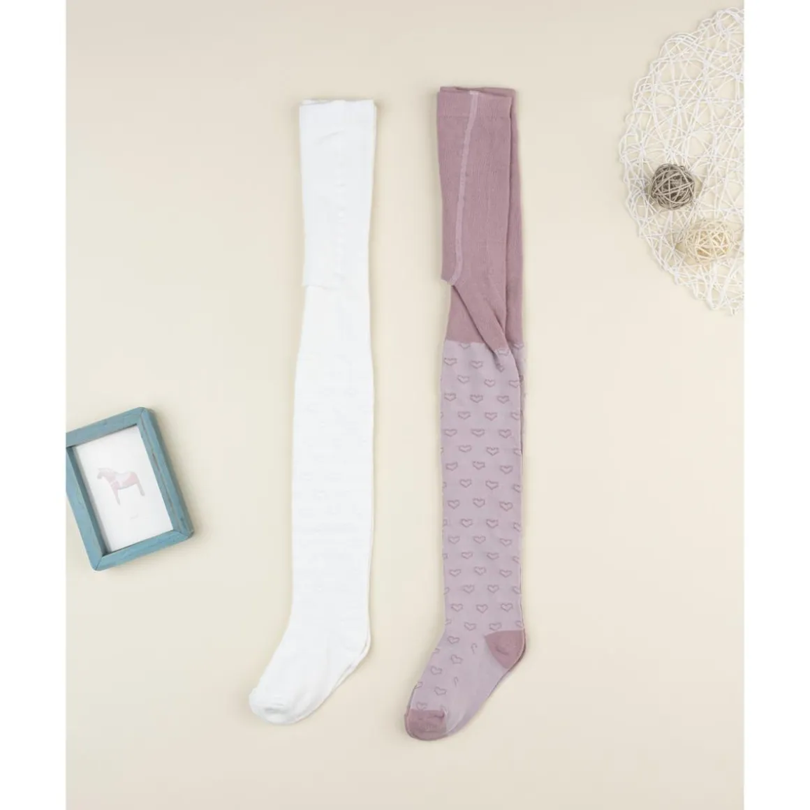 El pack de 2 leotardos para niña incluye un modelo en blanco y otro en rosa claro, ambos con estampado de corazones. Son básicos imprescindibles para el armario infantil, ya que combinan fácilmente con vestidos y faldas.