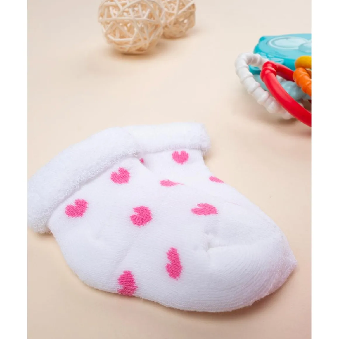 Este pack de 2 calcetines para recién nacida es perfecto para mantener los pies calentitos y cómodos. Incluye un par en color fucsia liso y otro en blanco con un delicado estampado de pequeños corazones fucsia.