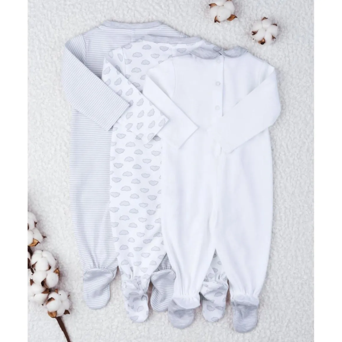 Adorable pack de 3 pijamas para niña en algodón grueso. Las tres prendas tienen mangas largas y pies cubiertos. El tono de los pijamas varía del blanco al gris claro y están adornados con suaves estampados de nubecitas o rayas horizontales. Los tres artículos presentan cuellos redondos en versión peter pan o simples y prácticos botones automáticos en el frente o en la parte trasera que permiten un fácil vestir. Accesorios no disponibles para la venta. El paquete contiene solo la prenda de vestir.
