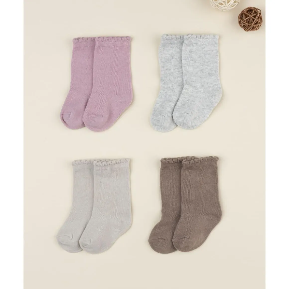 Este pack de calcetines para niña incluye cuatro pares en tonos rosa, gris, beige y marrón. Con diseño liso y ajuste suave, resultan cómodos para el uso diario. Un básico esencial para el vestuario infantil, que combina calidez y estilo sencillo.