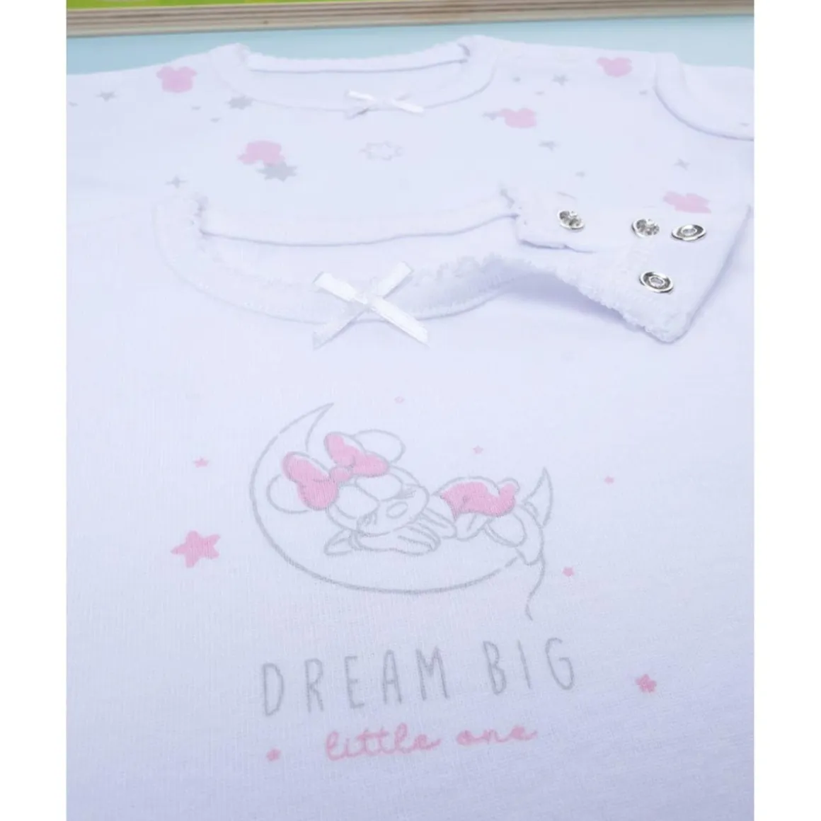 Pack básico de 2 bodies en algodón con base blanca y estampado estilizado de Minnie. Incluyen botones automáticos en la espalda y entrepierna. Fabricados en algodón Oeko-Tex, libres de sustancias nocivas.