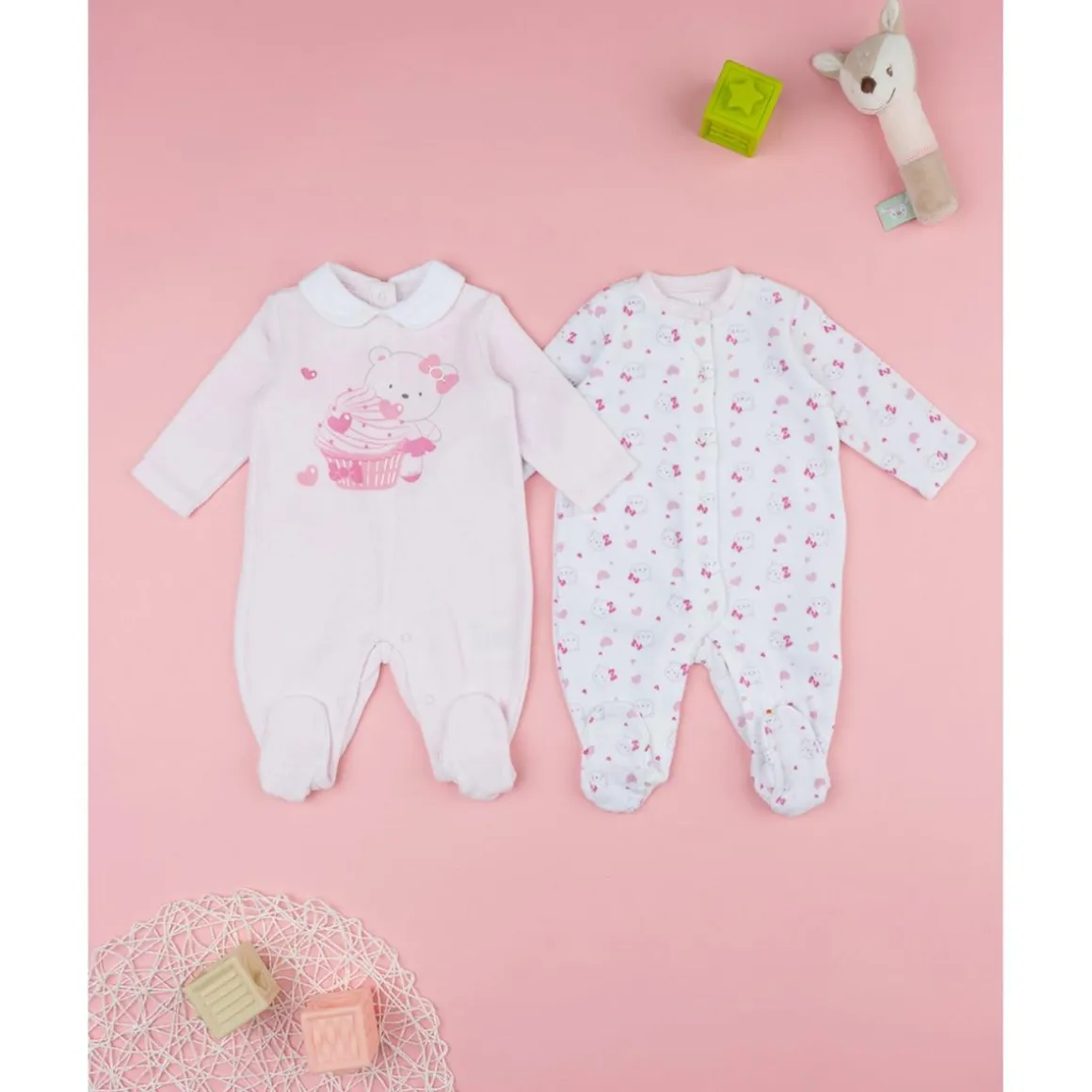 Este encantador pack incluye dos pijamas de chenilla con mangas largas y cuello redondo. Uno de los pijamas es de color rosa claro con la imagen de un tierno osito escondido detrás de un gran cupcake, y cuenta con cierres automáticos en la parte posterior y en la entrepierna. El otro es blanco con un estampado completo de pequeños gatitos y corazones, y dispone de cierres automáticos en la parte frontal.