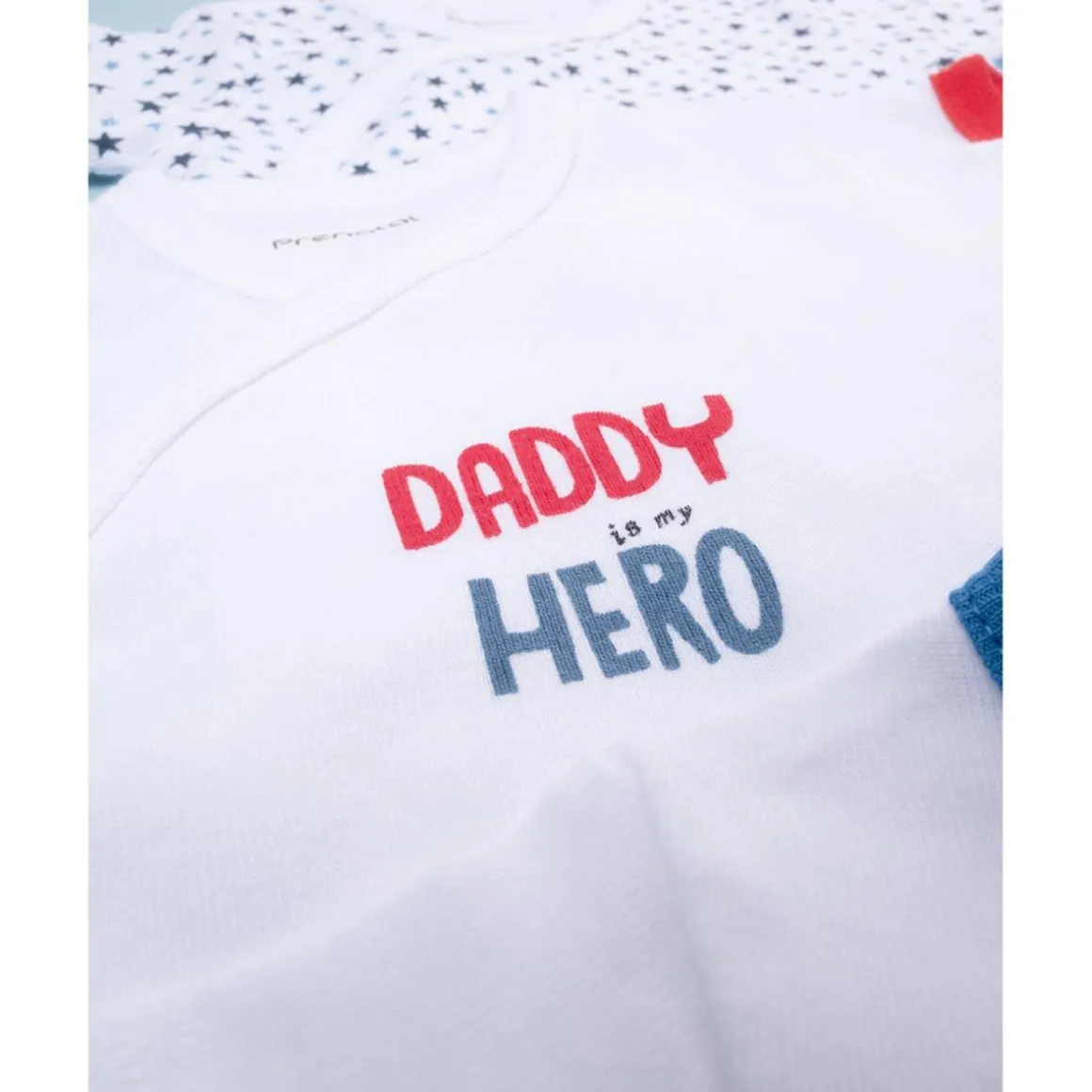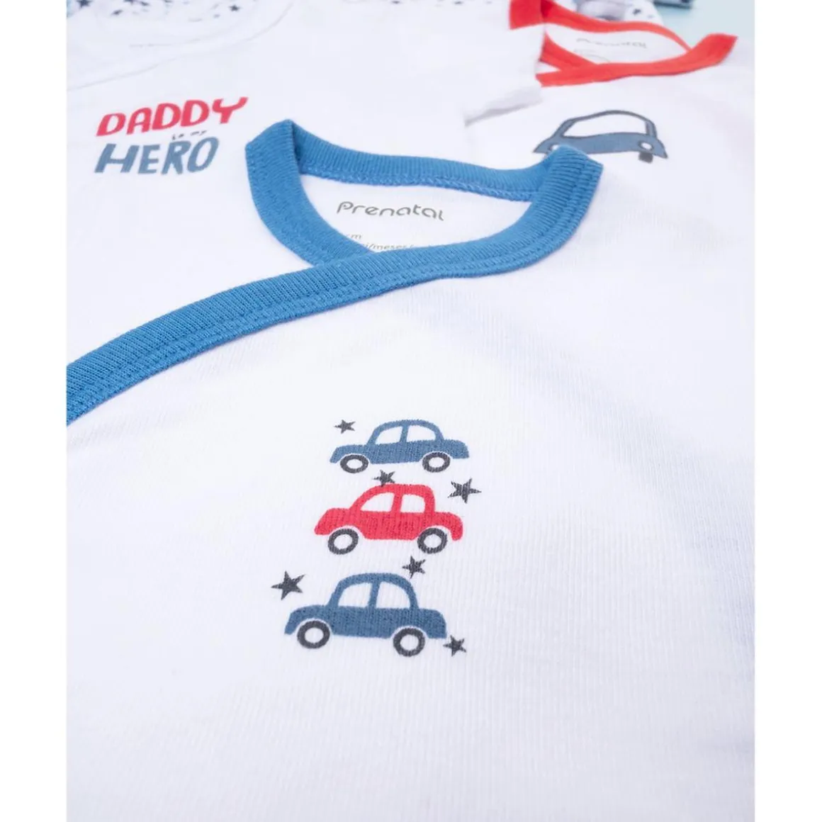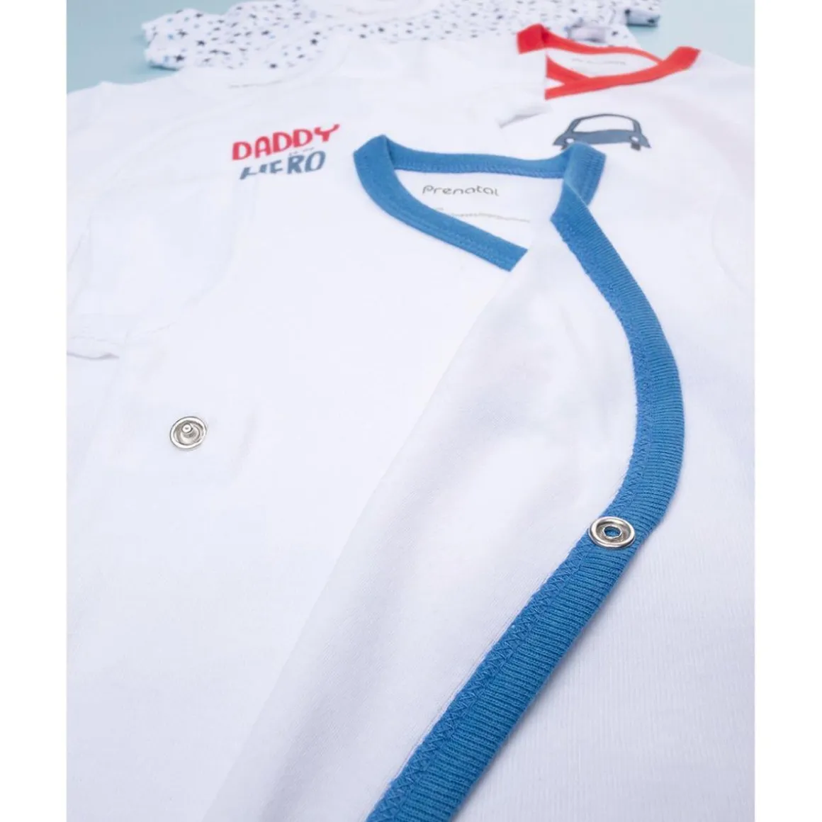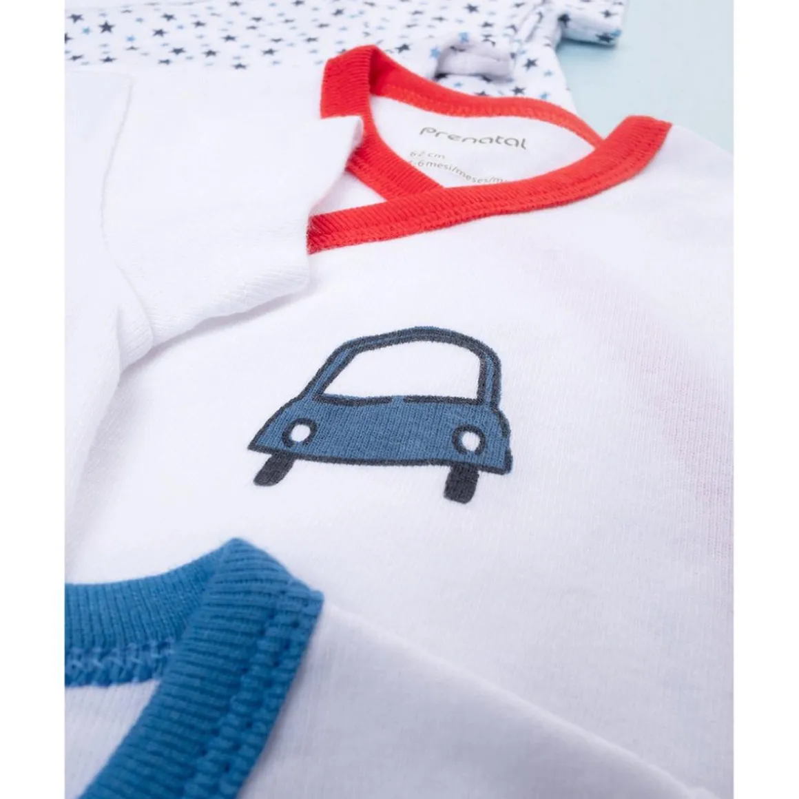 Pack de 5 bodies para bebé de manga corta. Incluye 3 bodies de color blanco con estampados decorativos y bordes en contraste y dos tienen un gracioso estampado de estrellitas. Ajuste práctico y cómodo gracias al cierre cruzado en el frente con prácticos botones de presión.