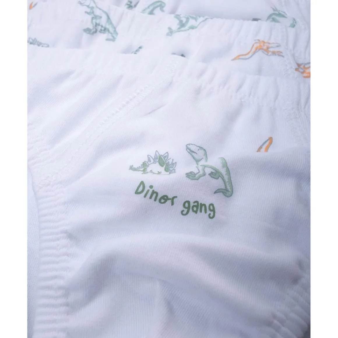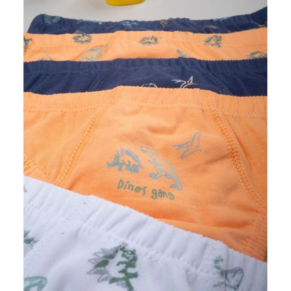 Económico pack de 7 braguitas infantiles en blanco, naranja y azul noche con divertidos estampados de dinosaurios. Cintura elástica y corte regular para máximo confort.