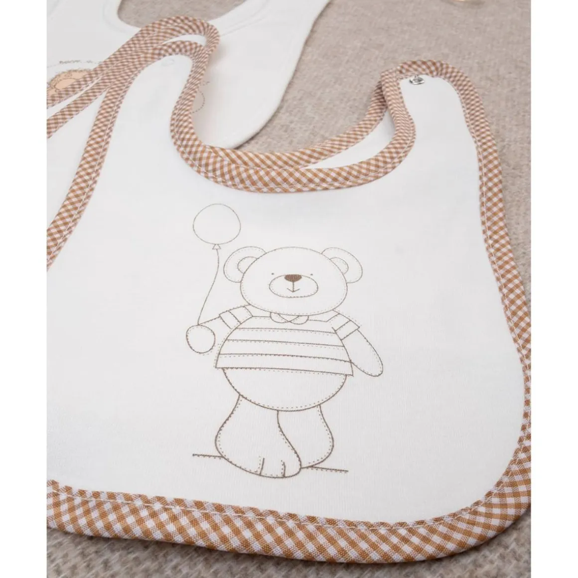 Cada babero cuenta con un cierre de botón a presión, fácil de poner y quitar. Su tejido es resistente y cómodo, ideal para las primeras comidas o para evitar manchas durante el biberón.