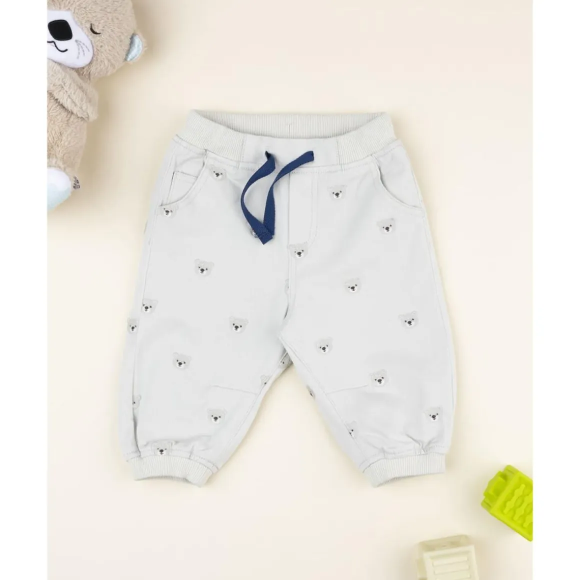 Estos pantalones infantiles en color beige destacan por su alegre estampado allover de ositos en azul. Con bolsillos laterales y cordón ajustable en la cintura, garantizan practicidad y comodidad en cada uso.