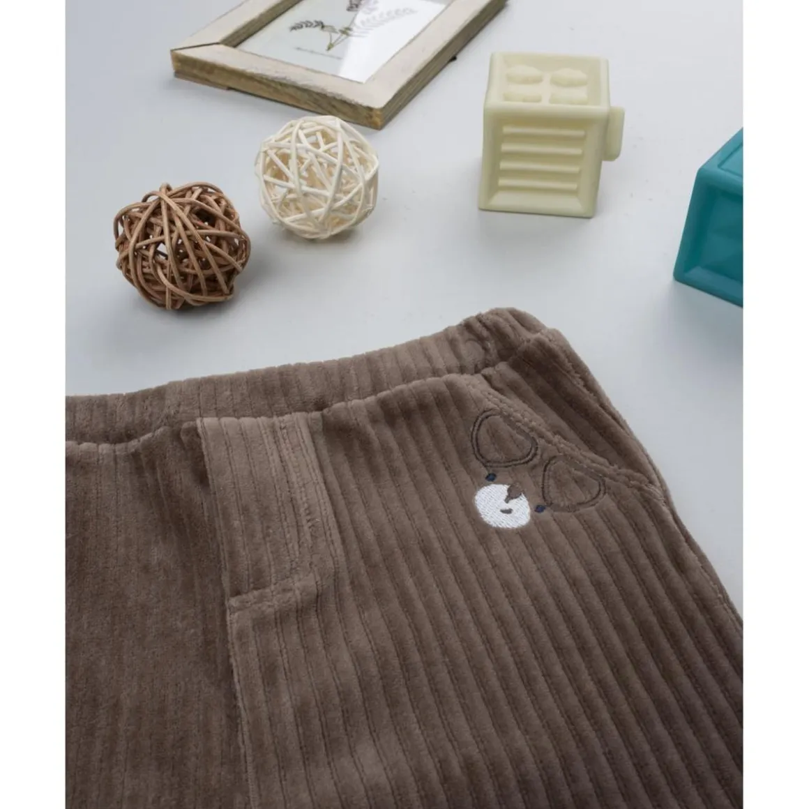 Este pantalón de pana en marrón para bebé combina calidez y estilo. Fabricado en tejido de canalé con mezcla de algodón y poliéster, resulta suave, resistente y cómodo. Incluye bolsillos laterales y un pequeño bordado decorativo que añade encanto al diseño.
