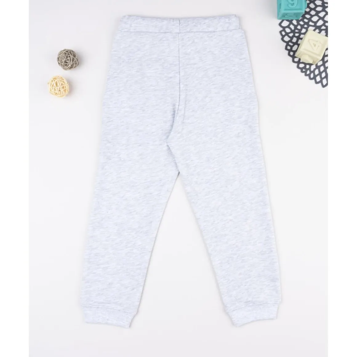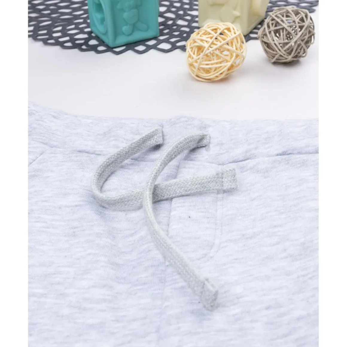 Pantalón en french terry gris claro con bolsillos laterales. Ajuste cómodo y regulable con cordón en la cintura. Estilo versátil y combinable.