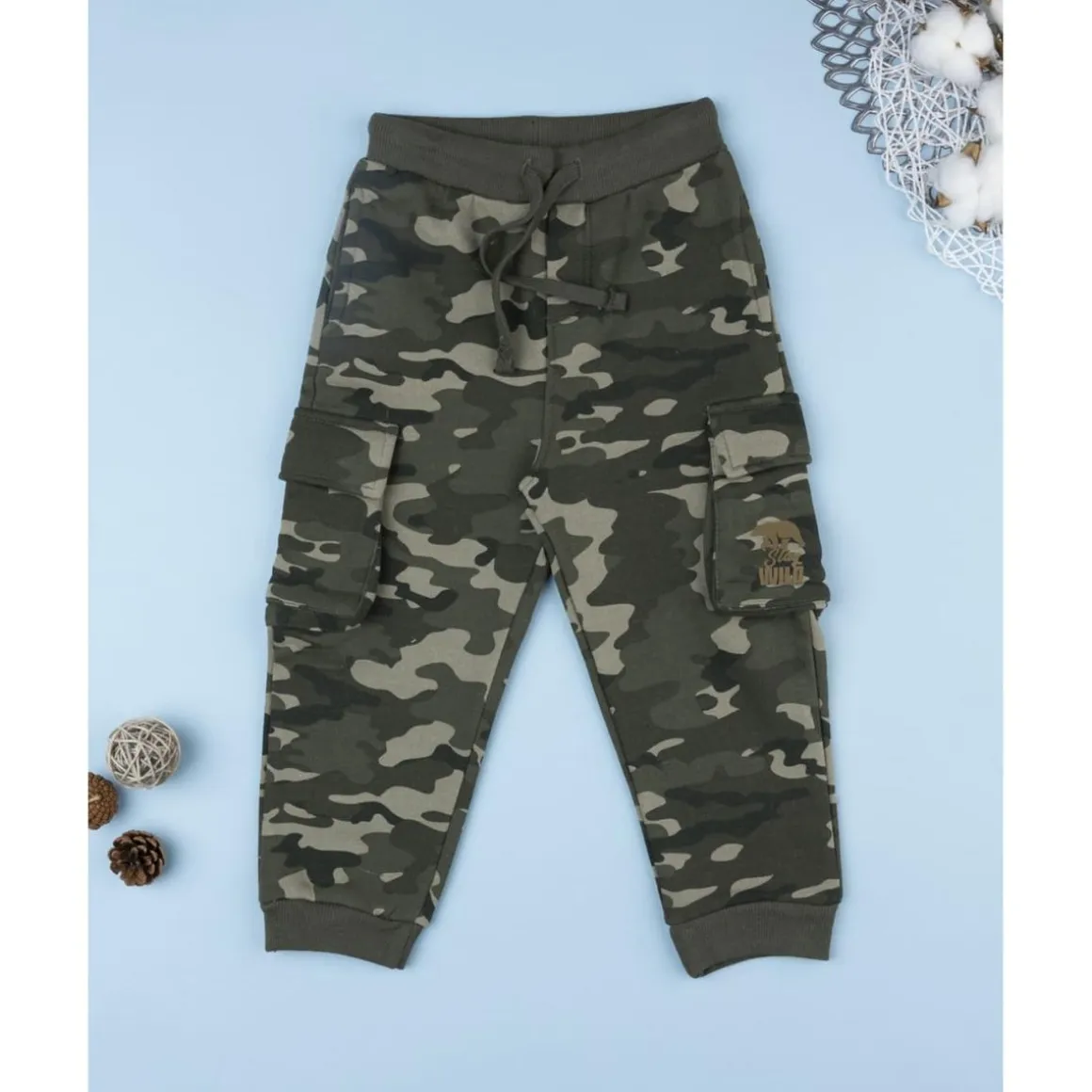 Original pantalón de niño con estampado camuflaje en verde militar. Su interior afelpado y cintura con cordón ajustable lo convierten en una prenda cómoda y cálida para el día a día.