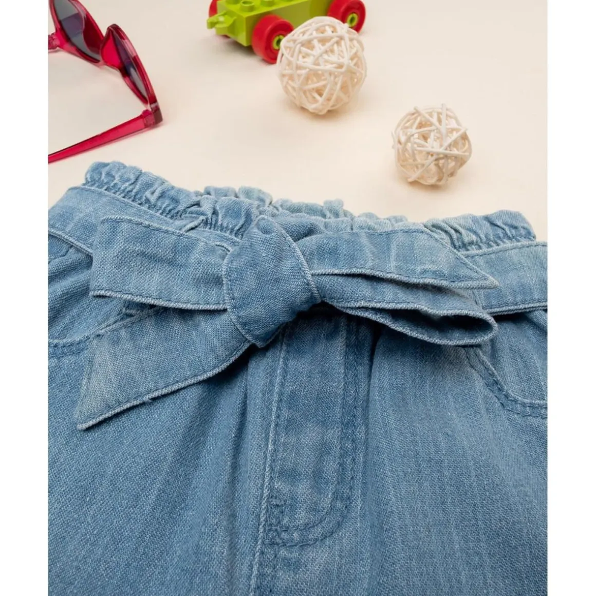 Pantalón casual para niña. La prenda se desarrolla en un total de azul denim claro con bolsillos contorneados en el frente. El ajuste es holgado y ajustable gracias al cinturón en la cintura con lazo. El pantalón para niña es fácilmente combinable y adecuado para ocasiones casuales. Accesorios no a la venta. El paquete contiene solo la prenda de vestir.