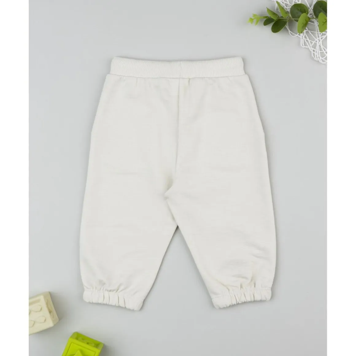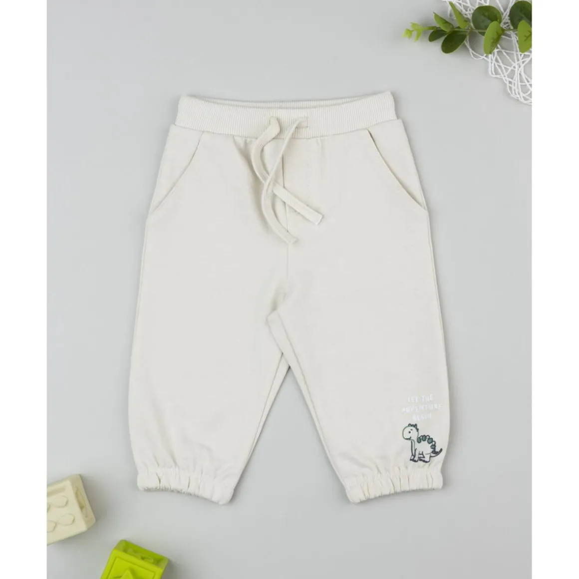 Estos pantalones para niño son ideales para un look casual y cómodo. Confeccionados en un suave terciopelo francés, los pantalones son de color beige con un estampado en relieve con temática de dinosaurios. Los pantalones cuentan con una cintura elástica ajustable gracias al cordón, lo que asegura un ajuste perfecto para el niño.