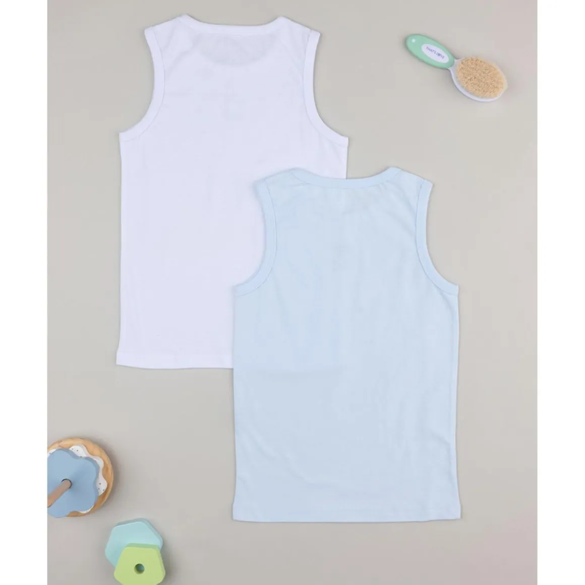 Paquete básico 2 camisetas de tirantes de niño. Las prendas se desarrollan en base blanco y azul con estampado coordinado. El ajuste es holgado y regular. La prenda es de algodón oeko-tex, probado para sustancias nocivas garantiza alta seguridad. Accesorios no a la venta. La confección contiene solo la prenda de vestir.