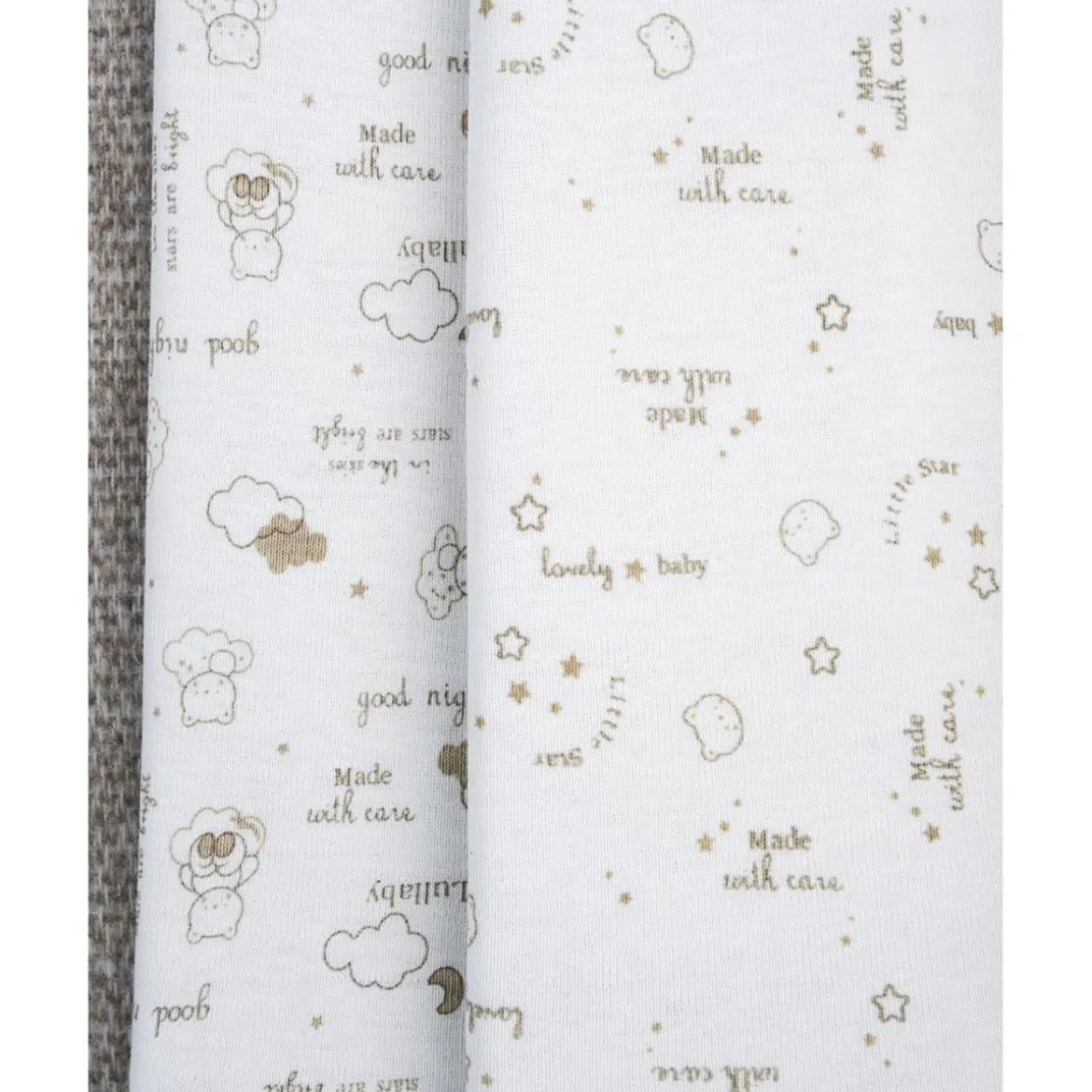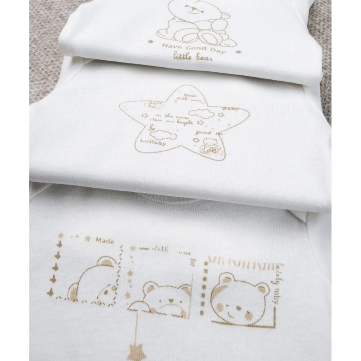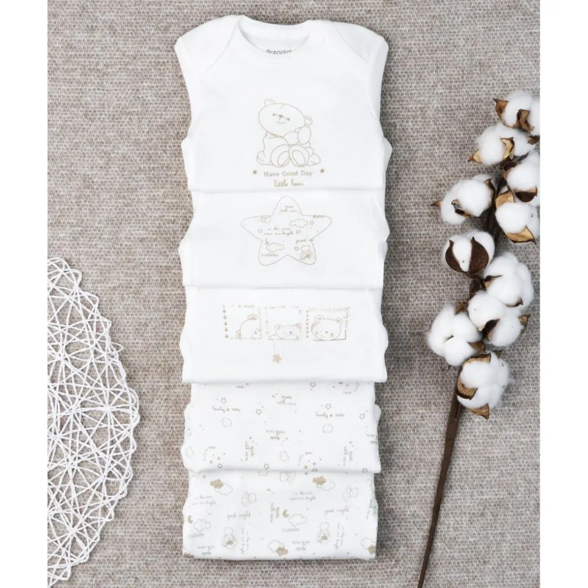 Delicado paquete de 5 bodies unisex de manga larga en 100% algodón. Las prendas son de fondo blanco y están enriquecidas con estampados diferentes como gatitos, ositos, estrellitas todas en tonos dorado y marcadas solo en los bordes. También hay inscripciones como «Lovely, baby, made with care». La vestimenta es práctica gracias a los botones automáticos presentes tanto en la parte trasera como en la entrepierna. Accesorios no a la venta. El paquete contiene solo la prenda de vestir