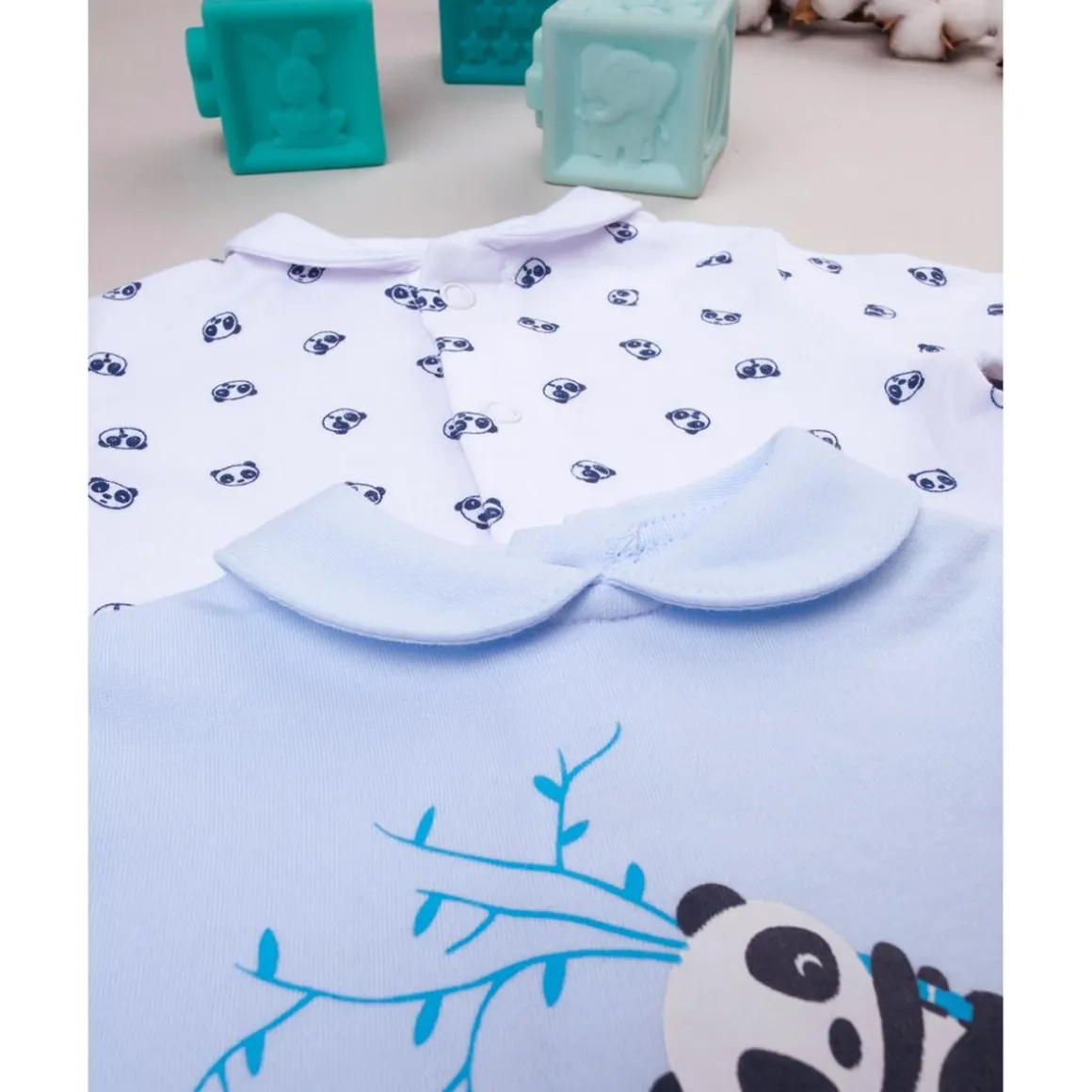 Pack de dos pijamas de interlock con mangas largas y cuello. Un pijama es de color azul claro con la estampa de dos pequeños pandas jugando con una caña de bambú y botones automáticos en la parte trasera y en la entrepierna; el otro es blanco con estampado integral de caritas de panda con botones automáticos en la parte delantera y en la entrepierna. Accesorios no a la venta. El paquete contiene solo la prenda de vestir.