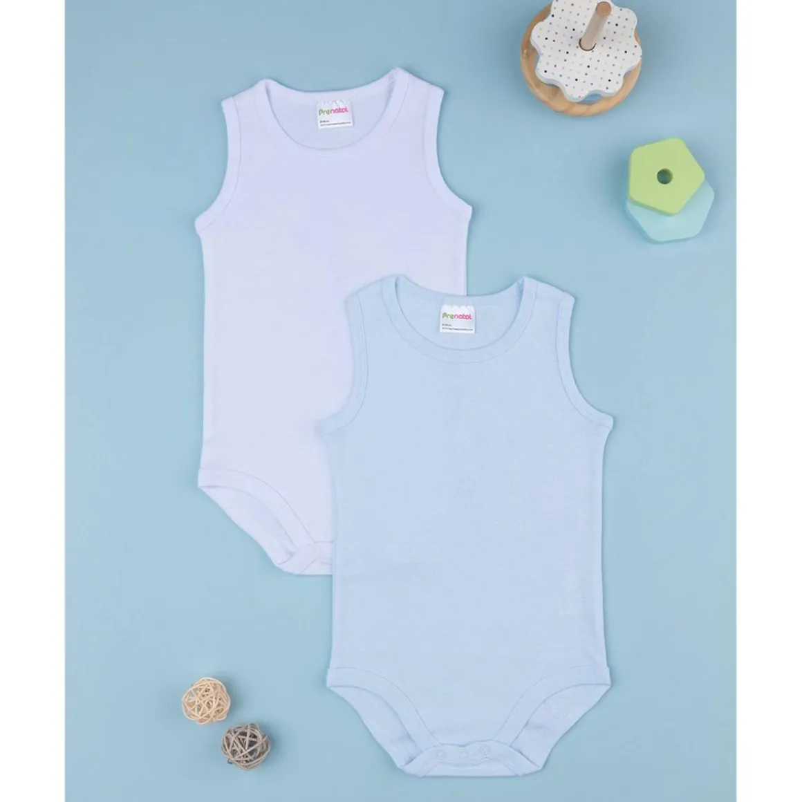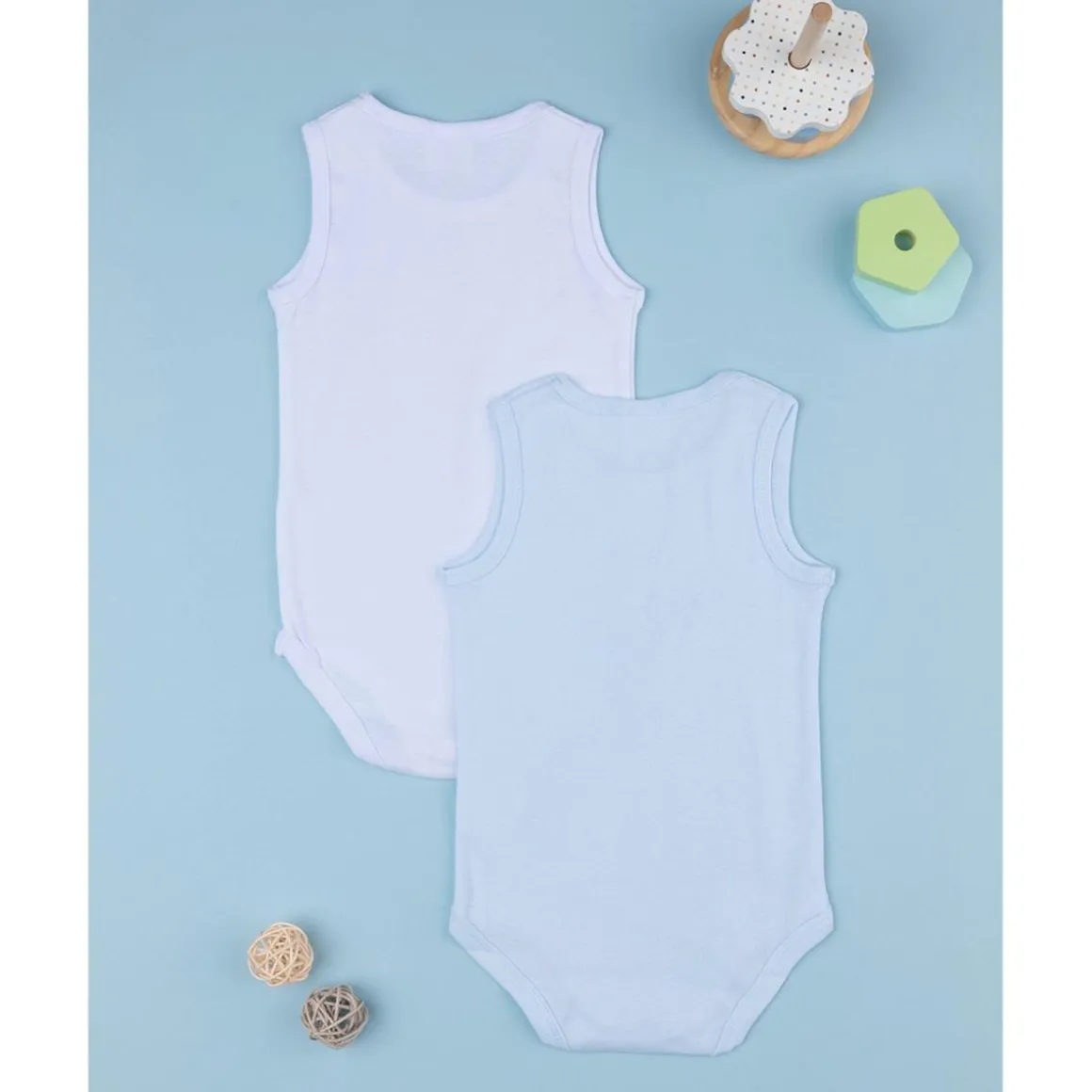 Un cómodo paquete compuesto por dos bodies de algodón, uno blanco y el otro azul. Un cierre cómodo con botones automáticos en la entrepierna completa la prenda.