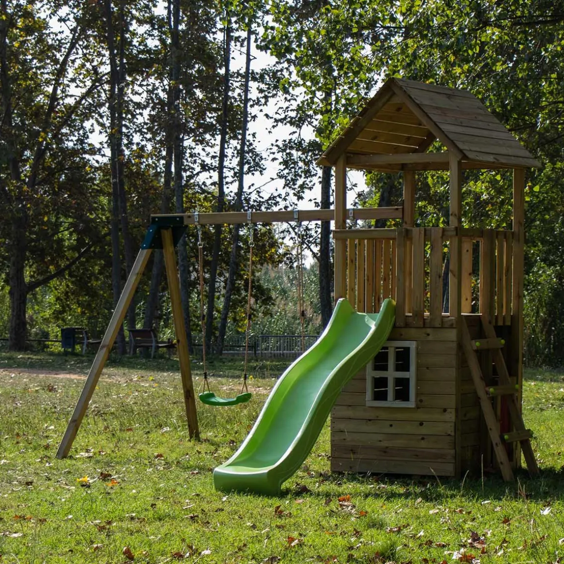 Parque juegos infantil de madera Tibidabo con caseta y columpio doble. El Parque infantil Tibidabo con casita y columpios, de la marca Masgames, es una torre de madera cuadrada fuerte y muy bonita para su jardín. Su estructura alberga una casita en toda la mitad inferior. La casita, cuyo techo es a la vez el piso de 120 cm de altura por el que bajar por el tobogán, es ideal para que los más pequeños se refugien, jueguen y sueñen con mil aventuras. También podrán guardar en ella sus juguetes. La casita cuenta con una puerta de media altura que, junto con la ventana que hay en uno de los laterales, permite la entrada de mucha luz para que los niños puedan jugar durante horas. Las maderas de la casita dan, a su vez, mucha resistencia y estabilidad al conjunto del parque.