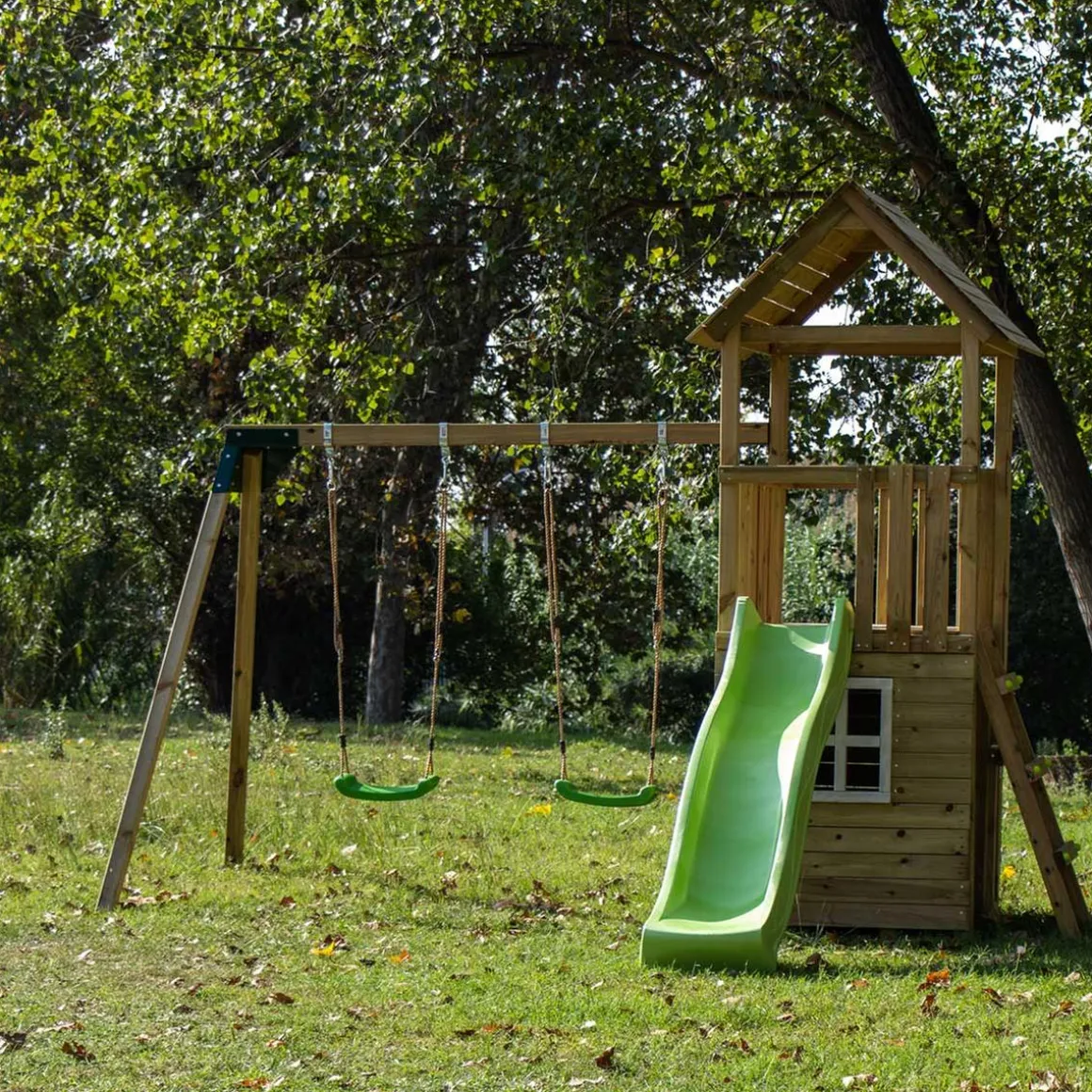 El parque infantil Tibidabo incluye todas las maderas para montar el parque, la casita, la estructura de columpio doble y la escalera, la tornillería, la rampa de tobogán de color verde, los asientos de columpio de color verde con cuerdas, los ganchos y los anclajes para fijarlos en un suelo blando de tierra o césped.