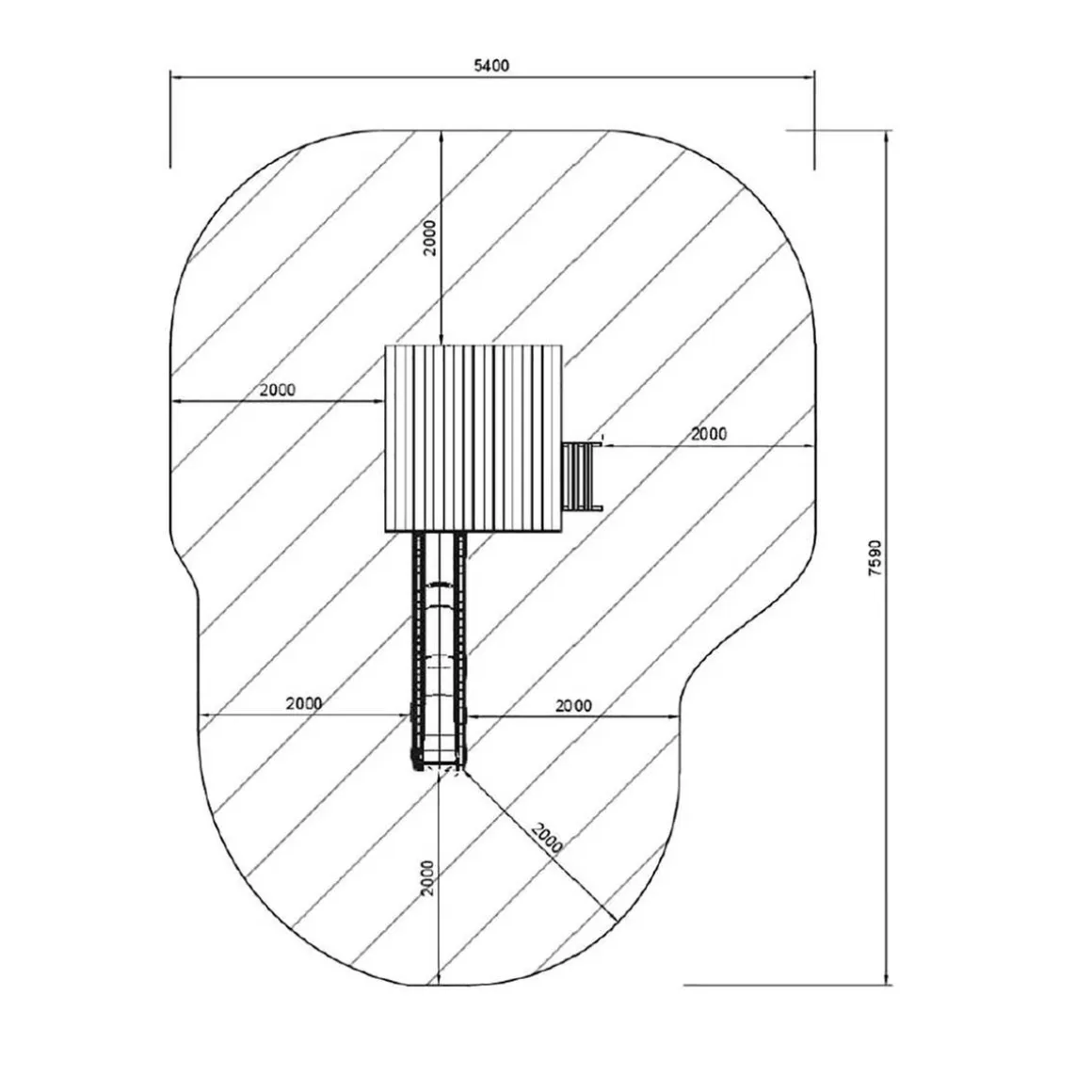 El acceso a la plataforma de la Torre Tibidabo es mediante una escalera de madera hasta el piso superior, a una altura de 120 cm. La plataforma, a esta altura, está protegida por los cuatro lados por la baranda de madera, por lo que queda muy protegida. Tiene aperturas solo en el acceso de la escalera y la salida del tobogán. La rampa de tobogán llevará a los niños a nivel del suelo, y volverá a empezar la aventura.