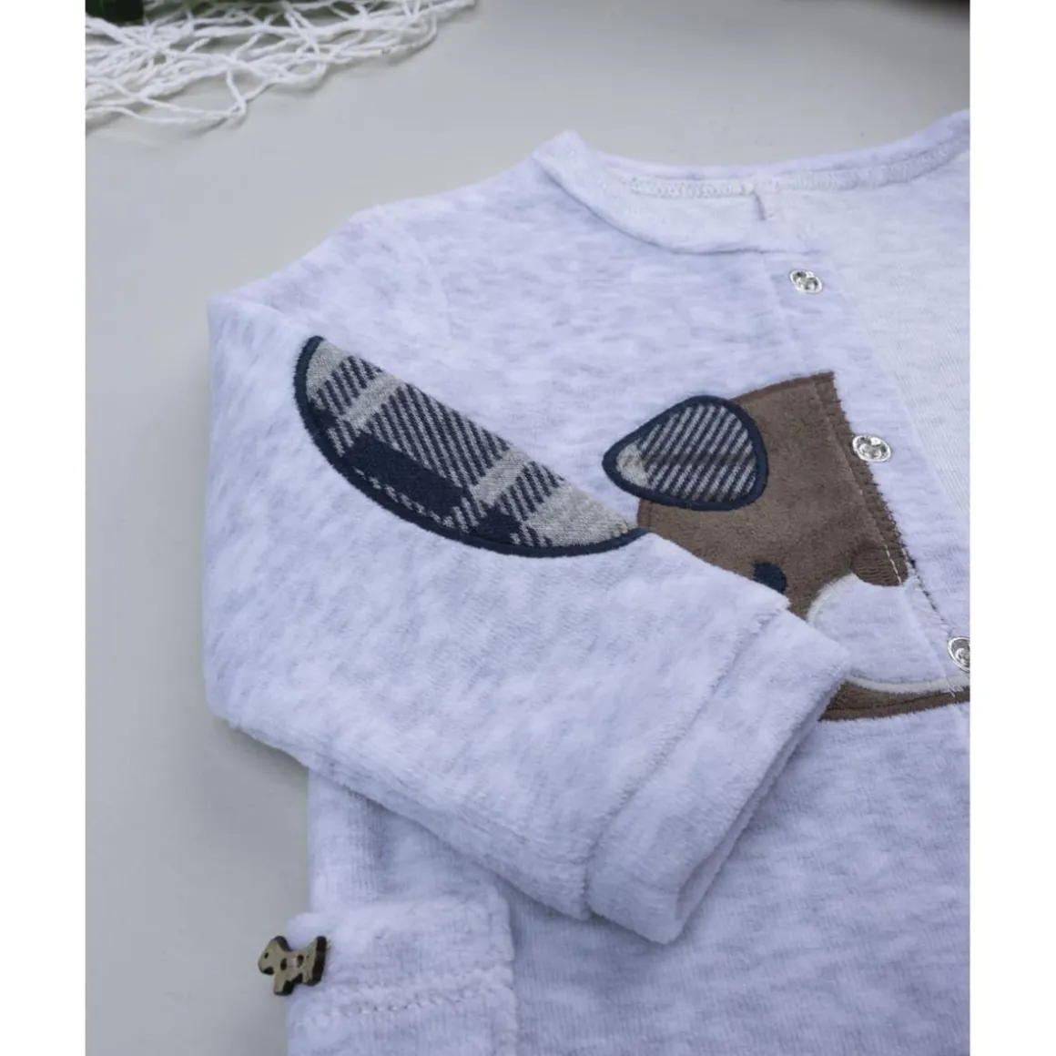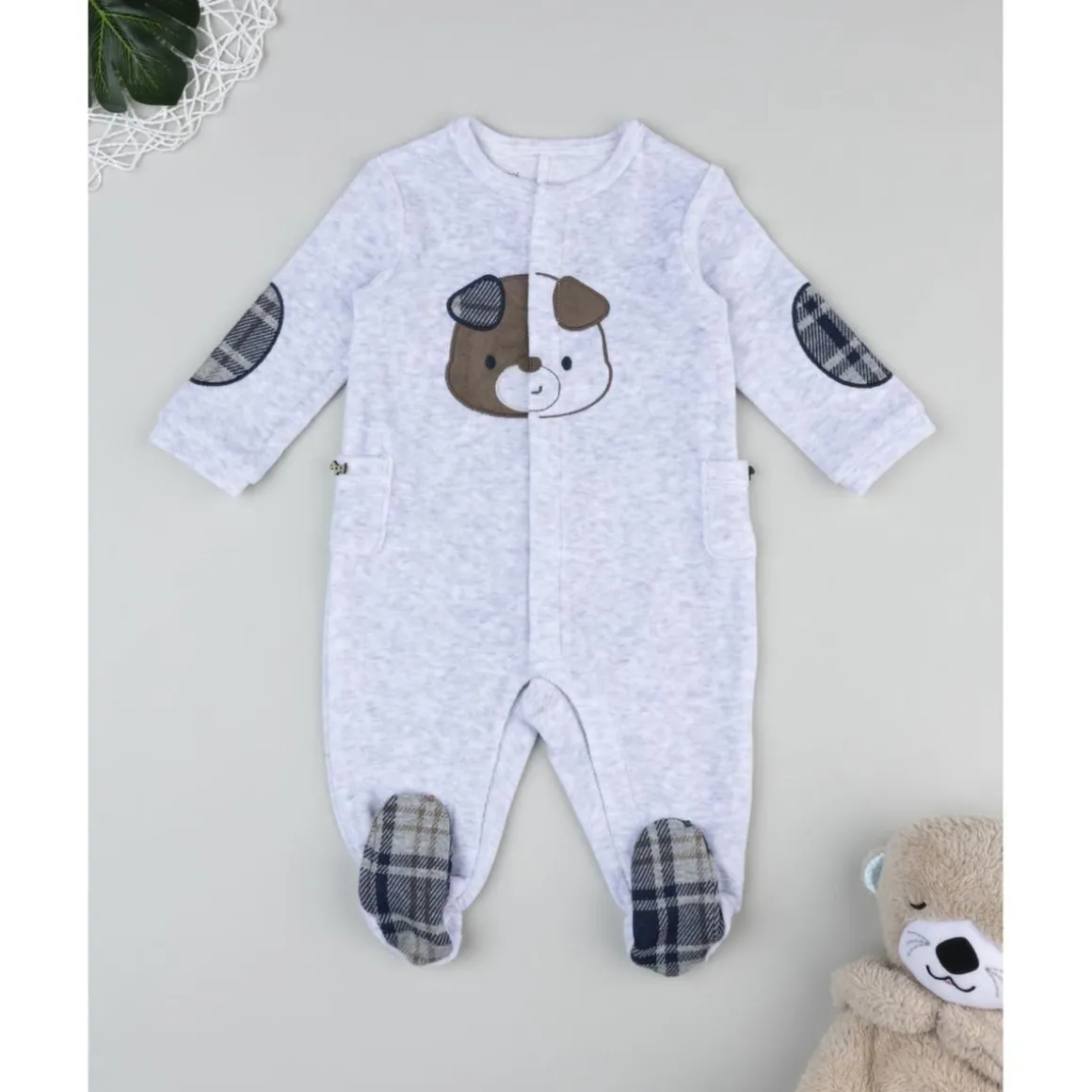 El pelele de terciopelo gris claro para niño es tierno y acogedor. Presenta aplicaciones de perrito en la parte frontal y se acompaña de patucos integrados para mantener los pies abrigados.