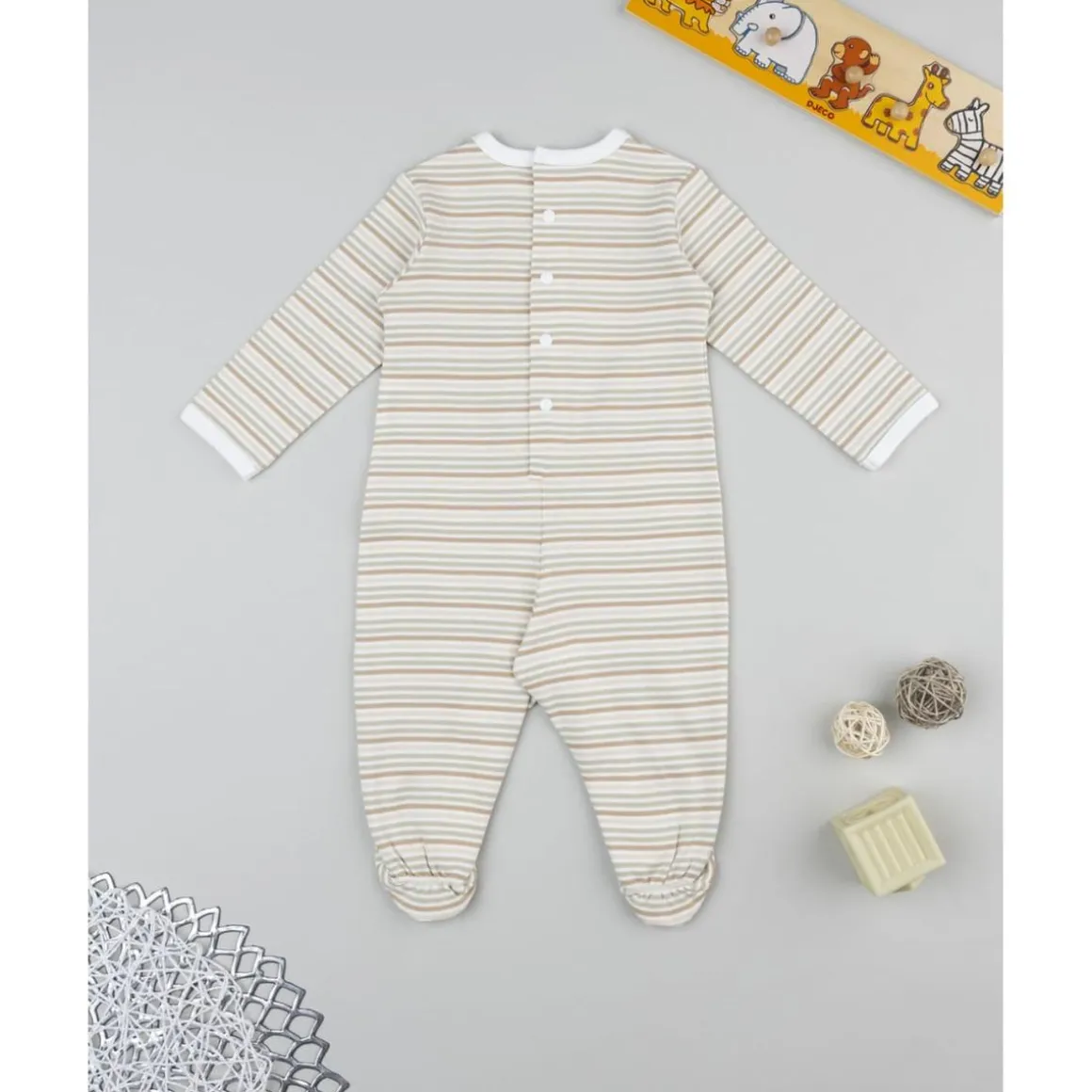 Tierno pelele de una pieza para niño con pies. Diseño a rayas verdes y marrones con pequeño estampado de león a juego. Cierre con botones automáticos en la espalda para vestir fácilmente. Algodón Oeko-Tex, probado contra sustancias nocivas. Accesorios no incluidos. La caja contiene solo la prenda.