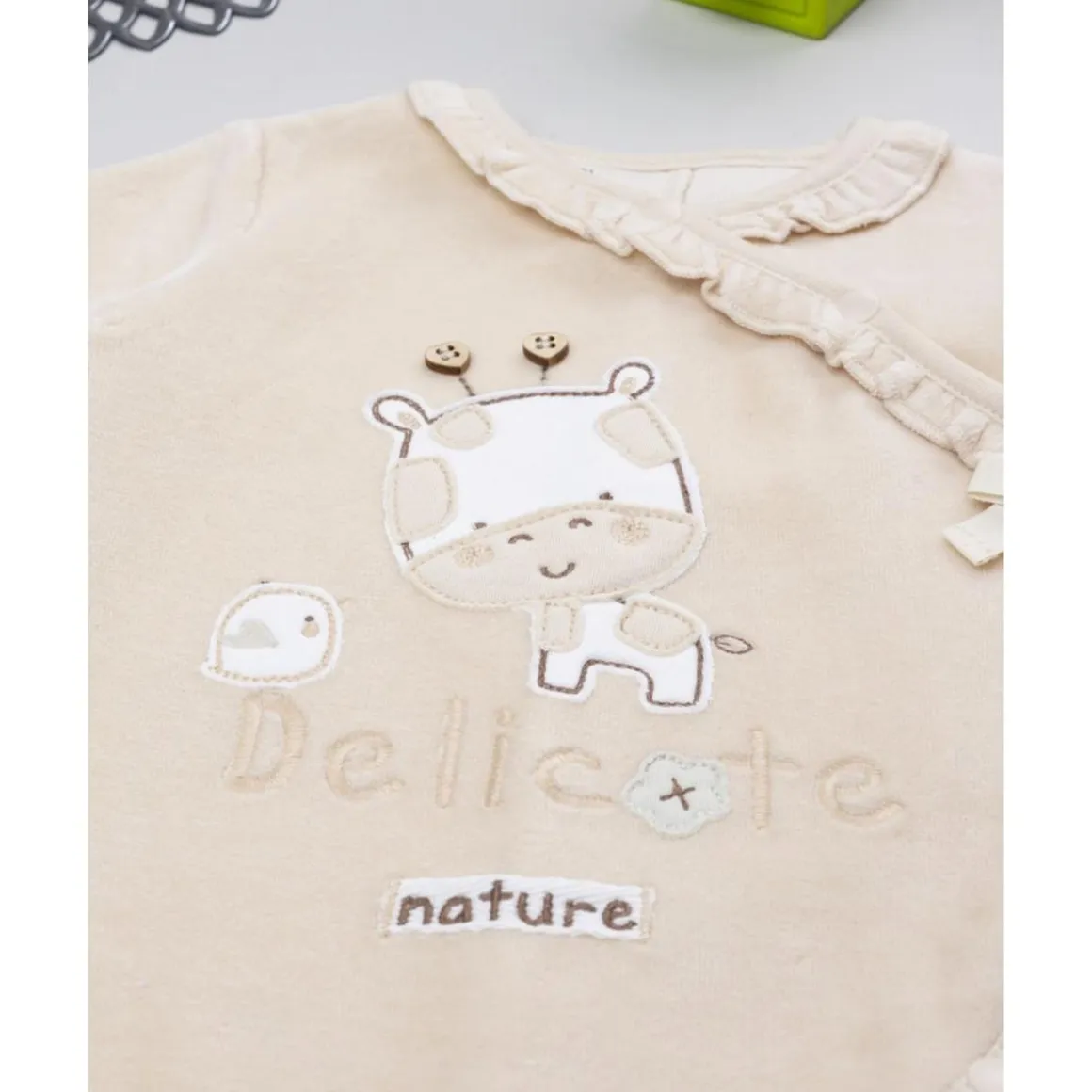 Tierno pelele de terciopelo para niña. Prenda de una sola pieza con pies, sobre base beige con imagen a juego. Ribete largo a lo largo del cierre y lacito tono sobre tono para un toque femenino y delicado. Ajuste cómodo con botones automáticos al frente en línea diagonal y entrepierna. Algodón Oeko-Tex, testado para garantizar seguridad. Accesorios no incluidos. La caja contiene solo la prenda de ropa.