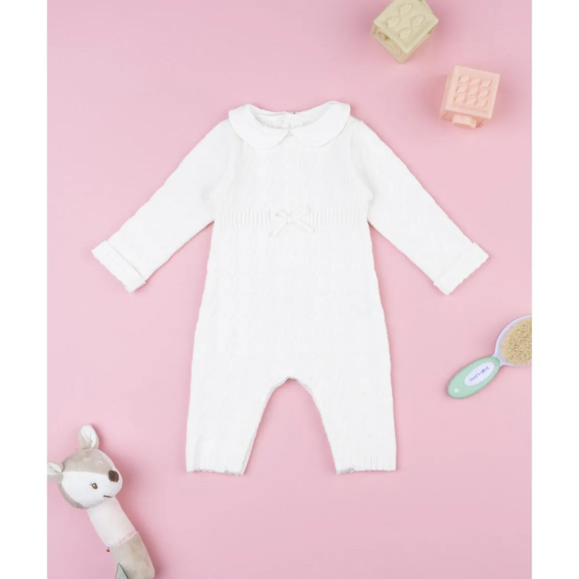 El pelele blanco de tricot para niña es elegante y delicado. Su diseño de punto con cuello y lazo decorativo frontal aporta un aire refinado, perfecto para ocasiones especiales.