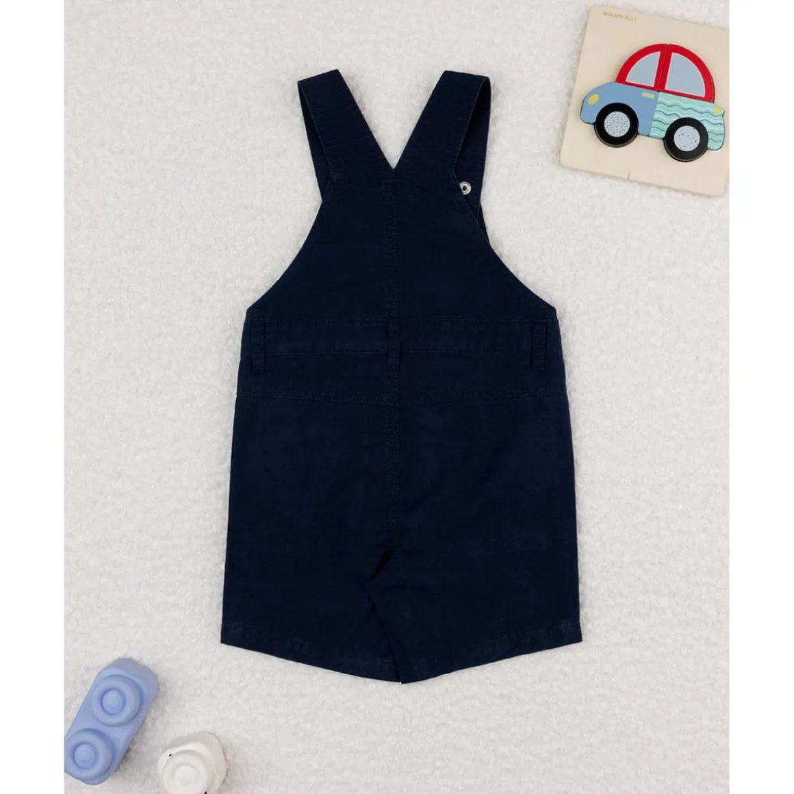Peto de popelina informal para niño. La prenda se presenta en un total azul noche con botones de metal coordinados. El ajuste es suelto y práctico. El peto es adecuado para ocasiones informales. Accesorios no a la venta. El paquete contiene solo la prenda de vestir.
