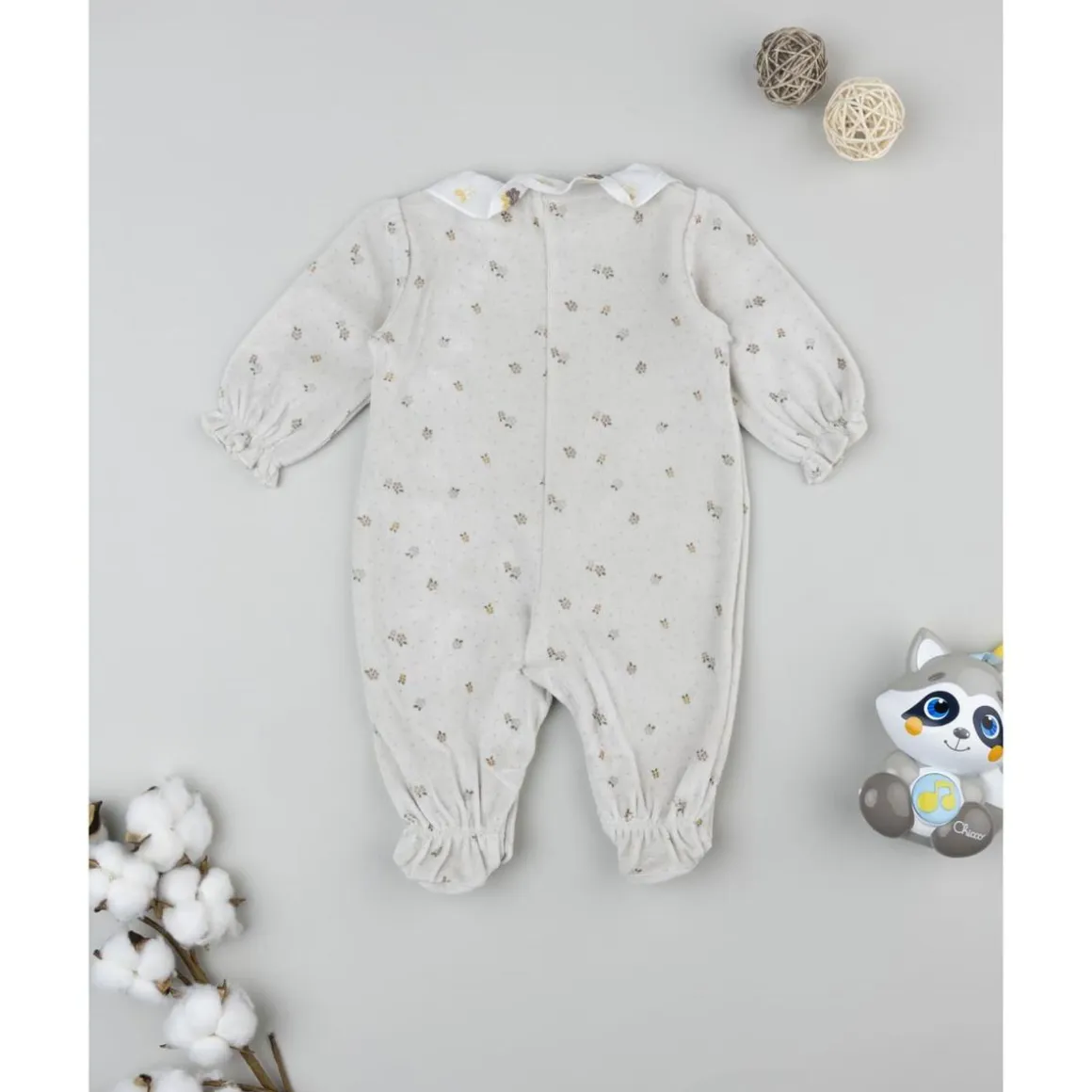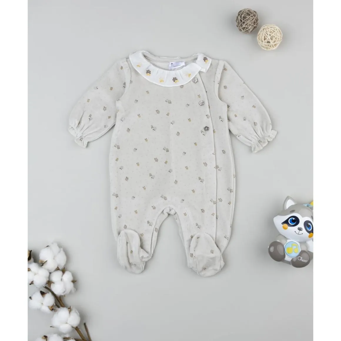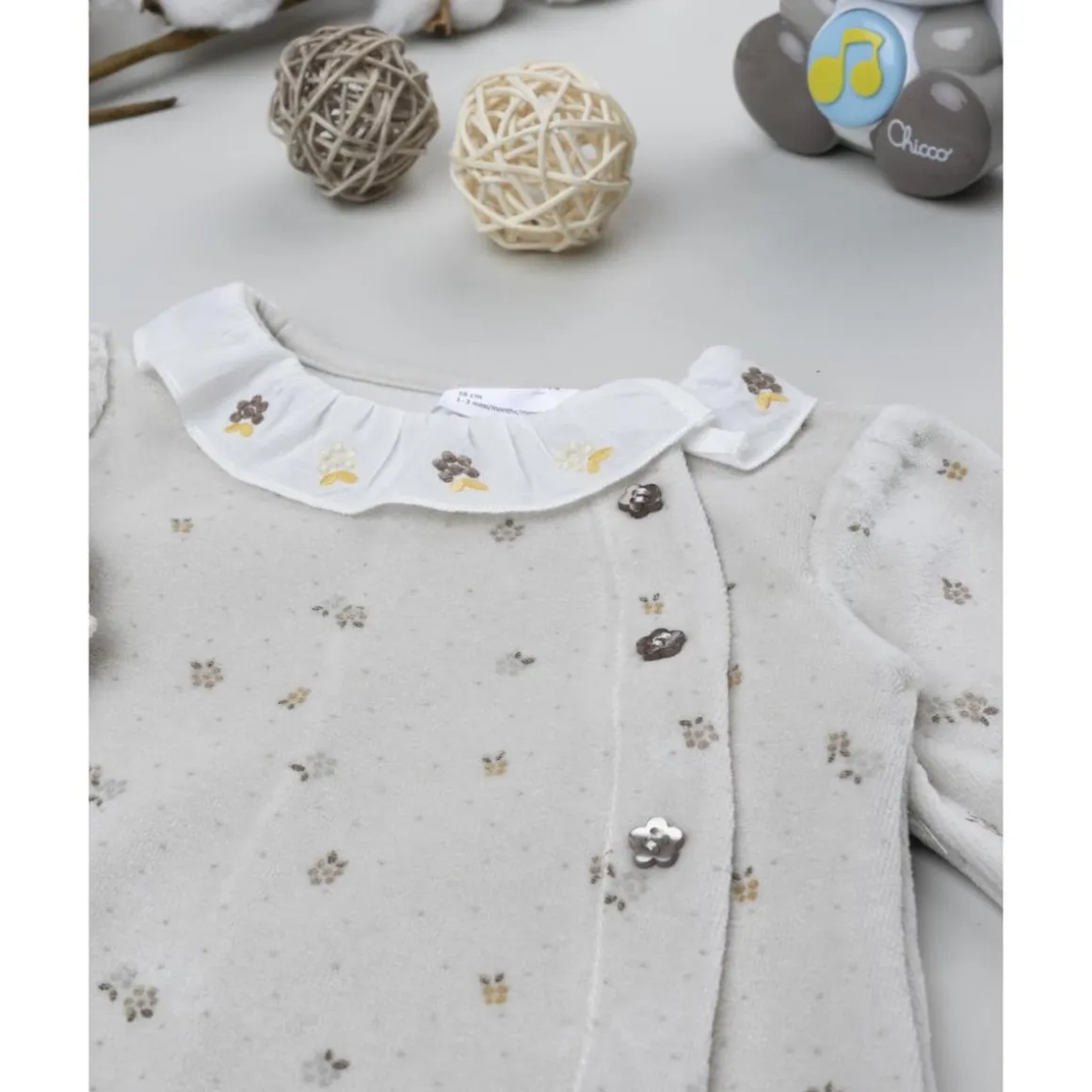 Este pijama de bebé de manga larga está confeccionado en felpa aterciopelada, ideal para mantener a la recién nacida abrigada y cómoda en sus primeros meses. Su diseño en marrón claro con bordados allover y cuello blanco bordado aporta un aire elegante y delicado. Incorpora pies cerrados y puños fruncidos para mayor ajuste y suavidad.