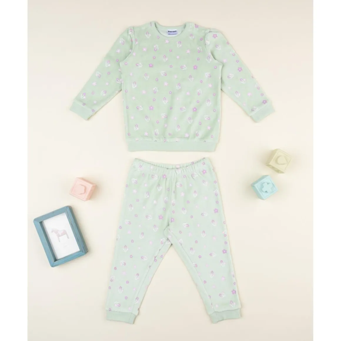 Este pijama de niña en terciopelo verde ofrece el máximo confort para el descanso. Compuesto por camiseta con estampado de florecitas y pantalón a juego con cintura elástica, proporciona una sensación cálida y acogedora ideal para las noches de invierno.