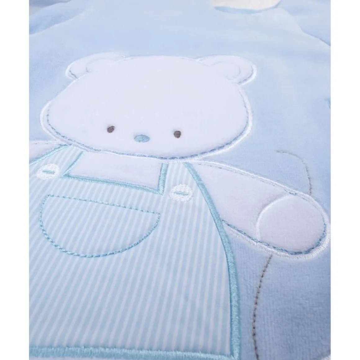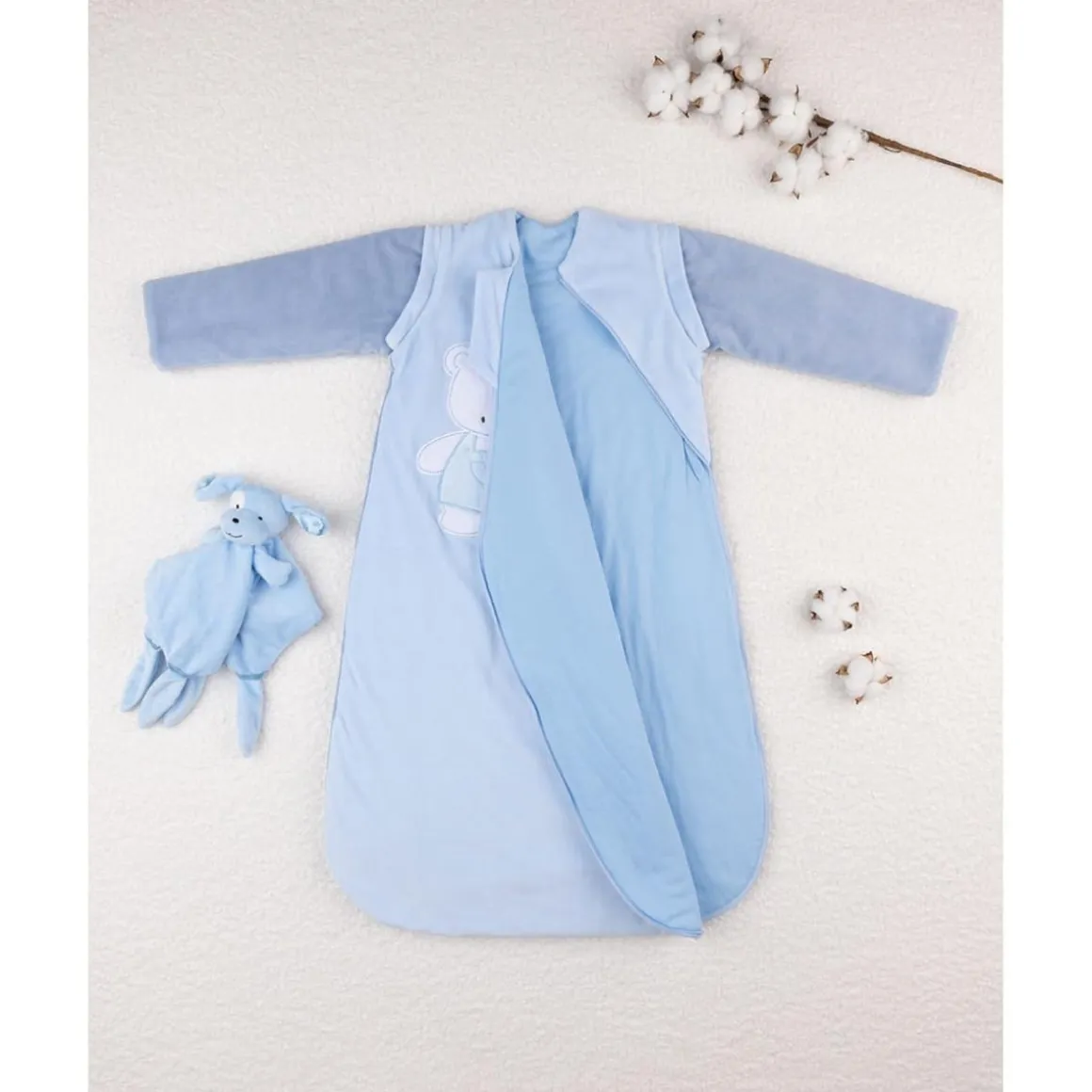 Este saco de dormir para bebé niño combina practicidad, seguridad y calidez, siendo perfecto para los meses más fríos del año. Fabricado en suave ciniglia con interior en algodón 100%, asegura un tacto agradable y transpirable sobre la piel del recién nacido. Su diseño en azul claro con mangas en azul marino a contraste se completa con un detalle gráfico en el centro, logrando un estilo tierno y moderno a la vez.
