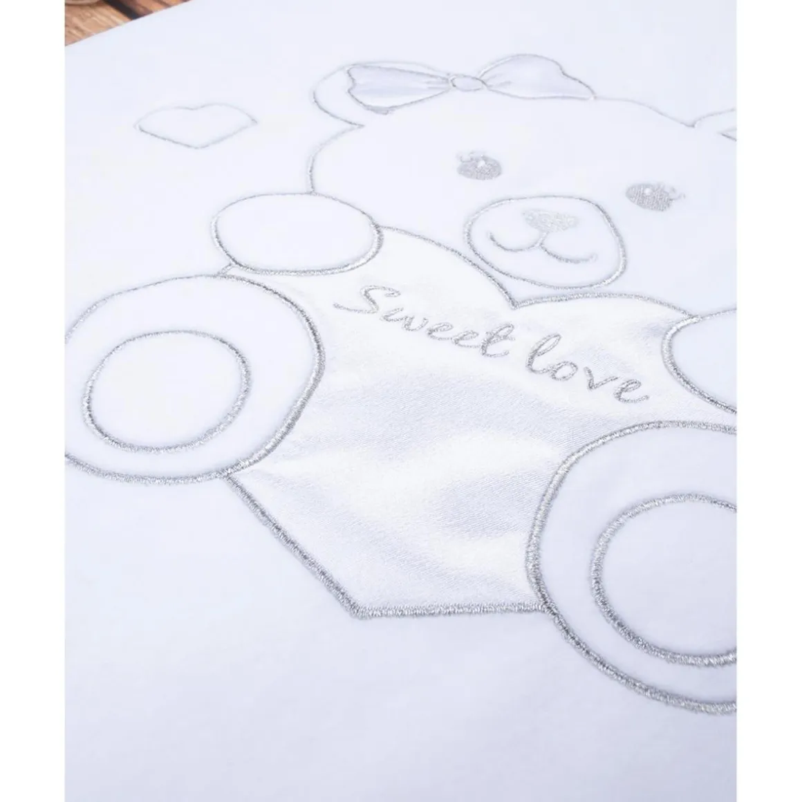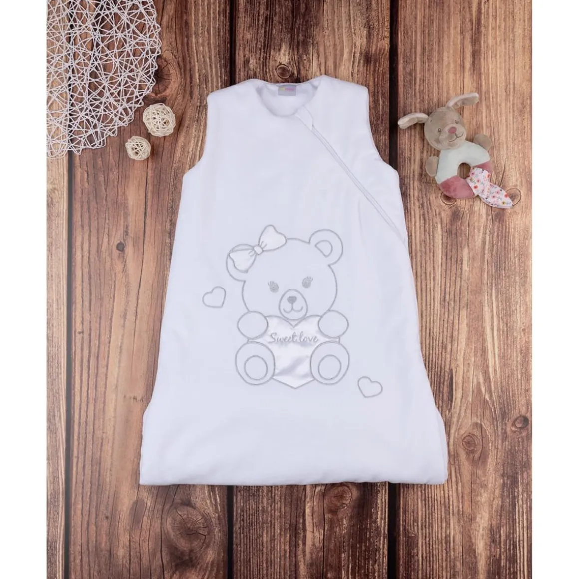 Saco de dormir en felpa blanco con bordado central de un adorable osito en gris claro. Cierre con botones automáticos. Suave y envolvente para una noche cálida y tranquila.