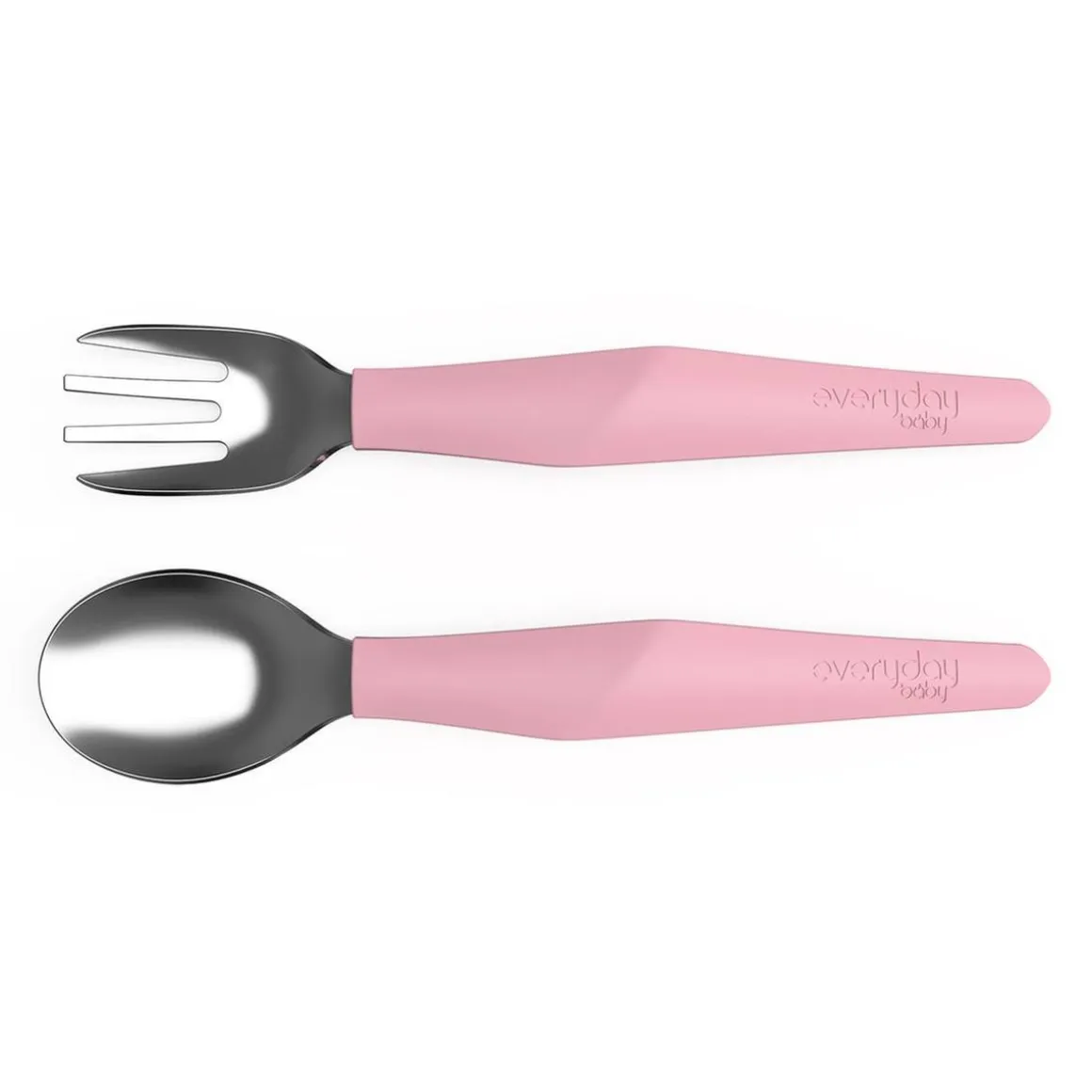 Set de cubiertos para bebé rosa claro, un set de cuchara y tenedor de color rosa claro.