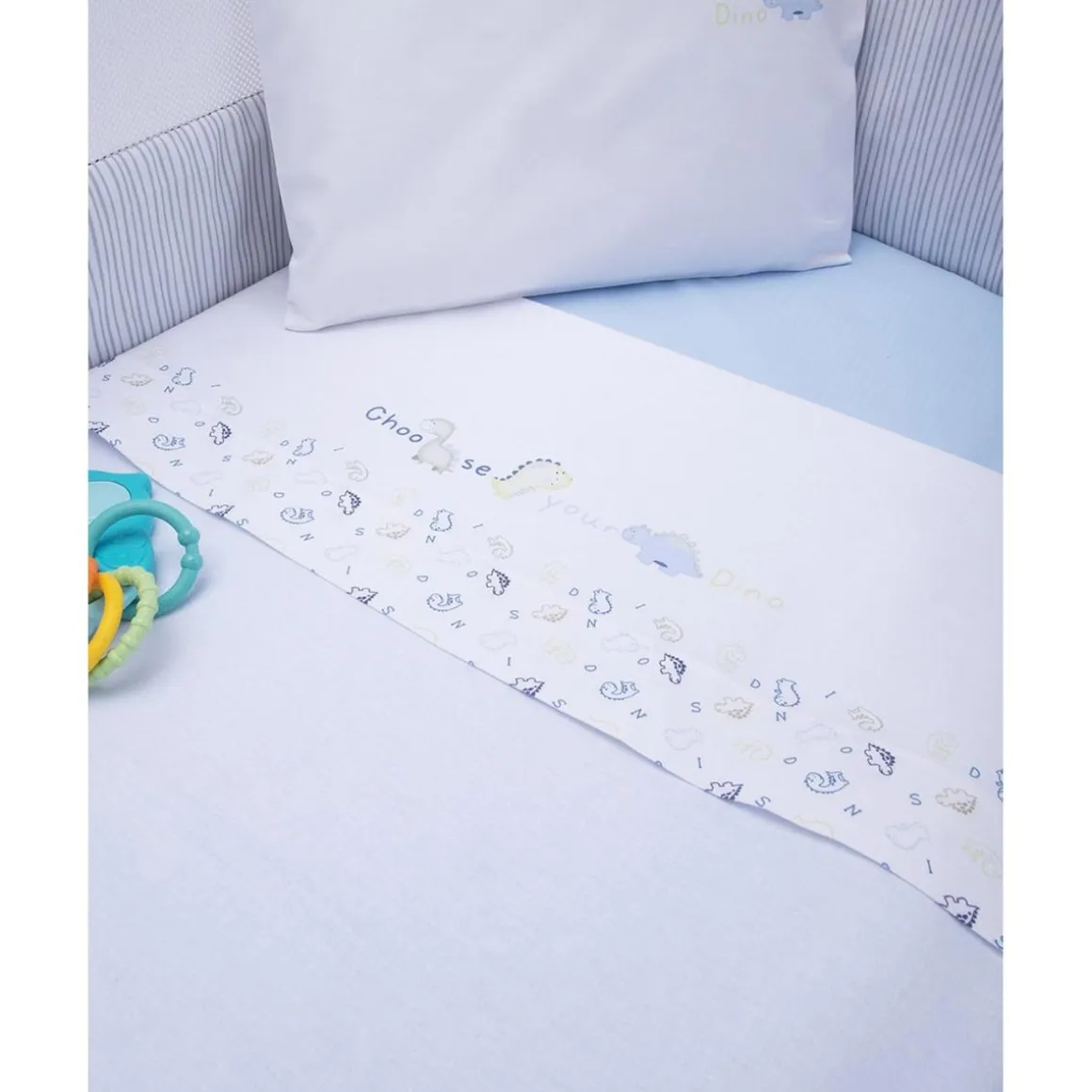 Tierno set de cuna de 3 piezas en 100% algodón. Diseño en blanco con estampado de dinosaurios en tonos azul y verde.