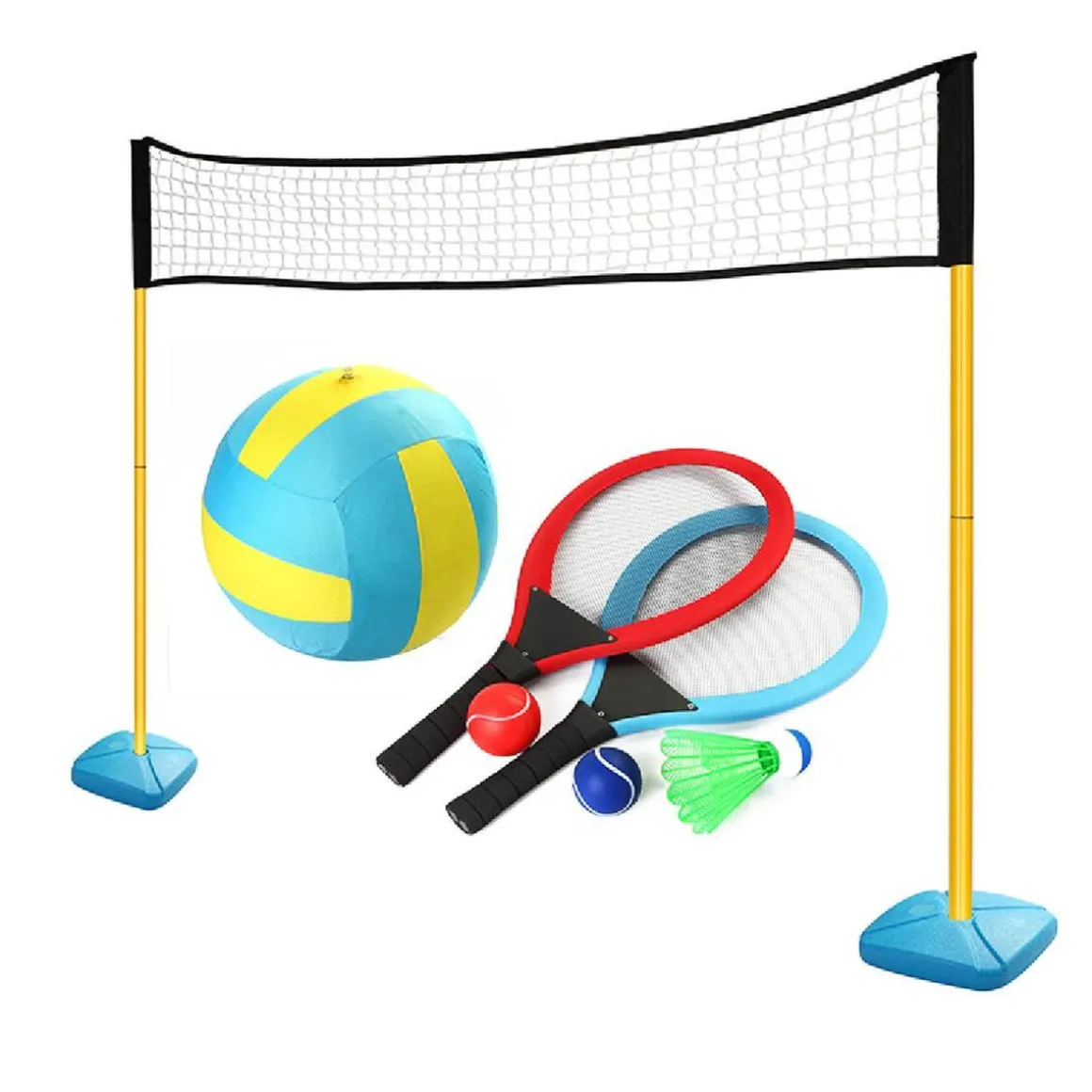 El set incluye 2 raquetas, red, volante de badminton, pelotas de tenis y pelota de voleibol.