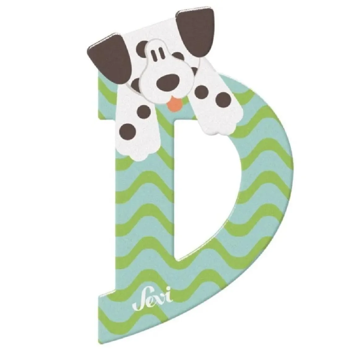 Fabricada en madera ligera, esta letra está pintada a mano con colores suaves y vivos. Cada letra de la serie representa la inicial de un animal; en este caso, la ‘D’ está asociada al dálmata, introduciendo a los niños en el mundo animal mientras aprenden a reconocer letras y sonidos.