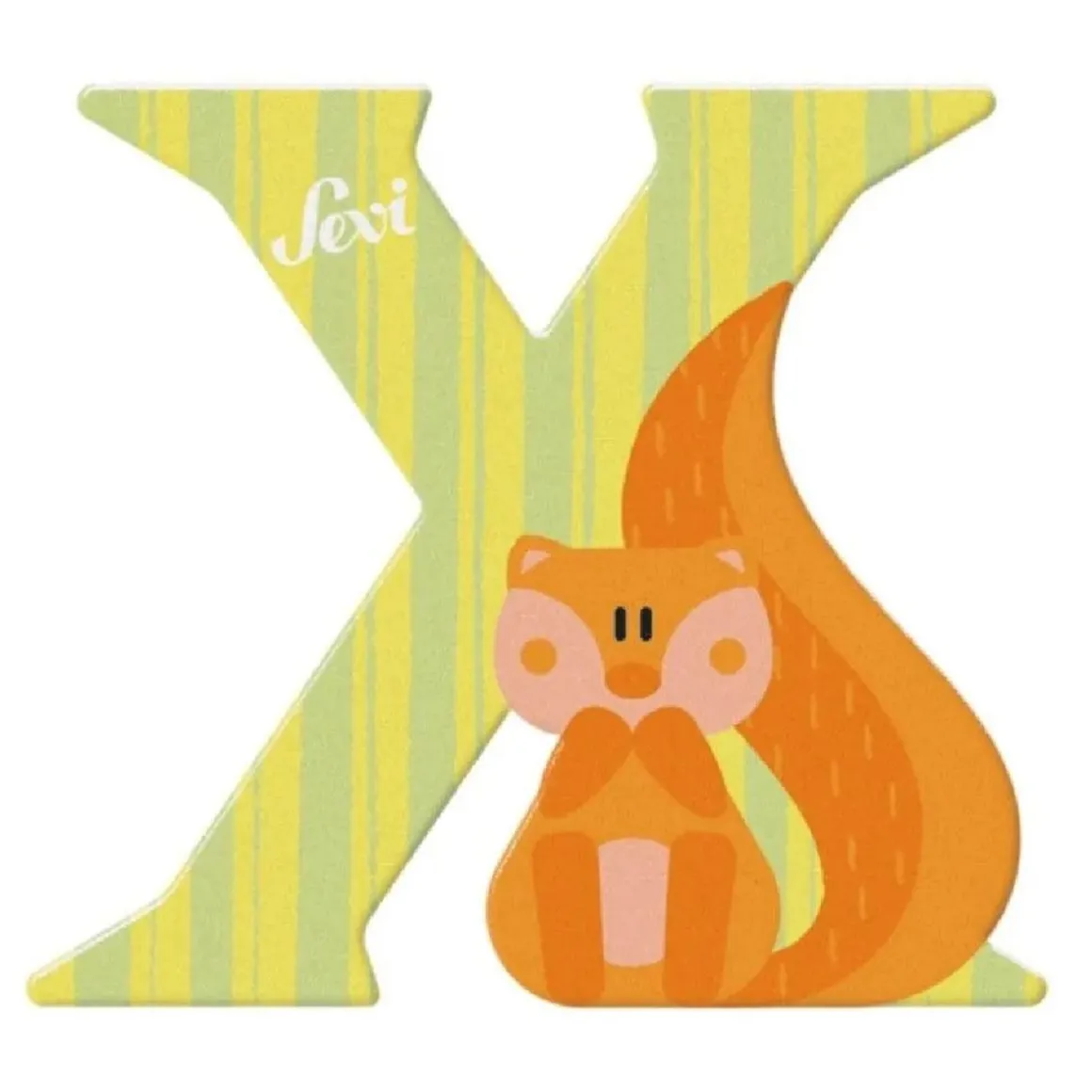 La Letra X de madera de Sevi presenta un diseño único con la figura de una ardilla, perfecta para decorar la habitación de tu hijo o para enseñar el alfabeto de manera divertida.