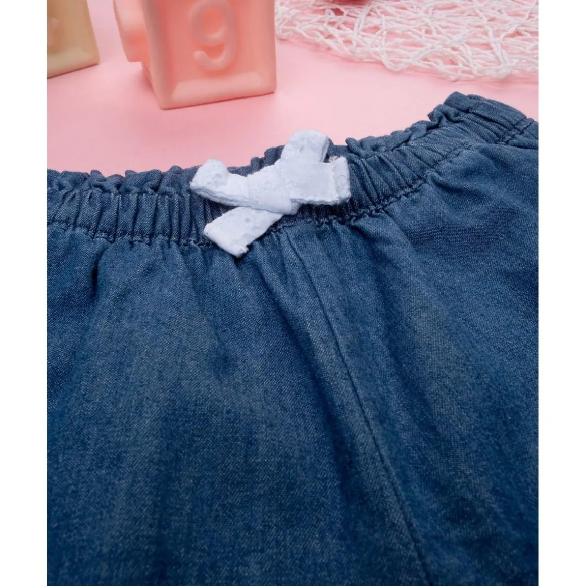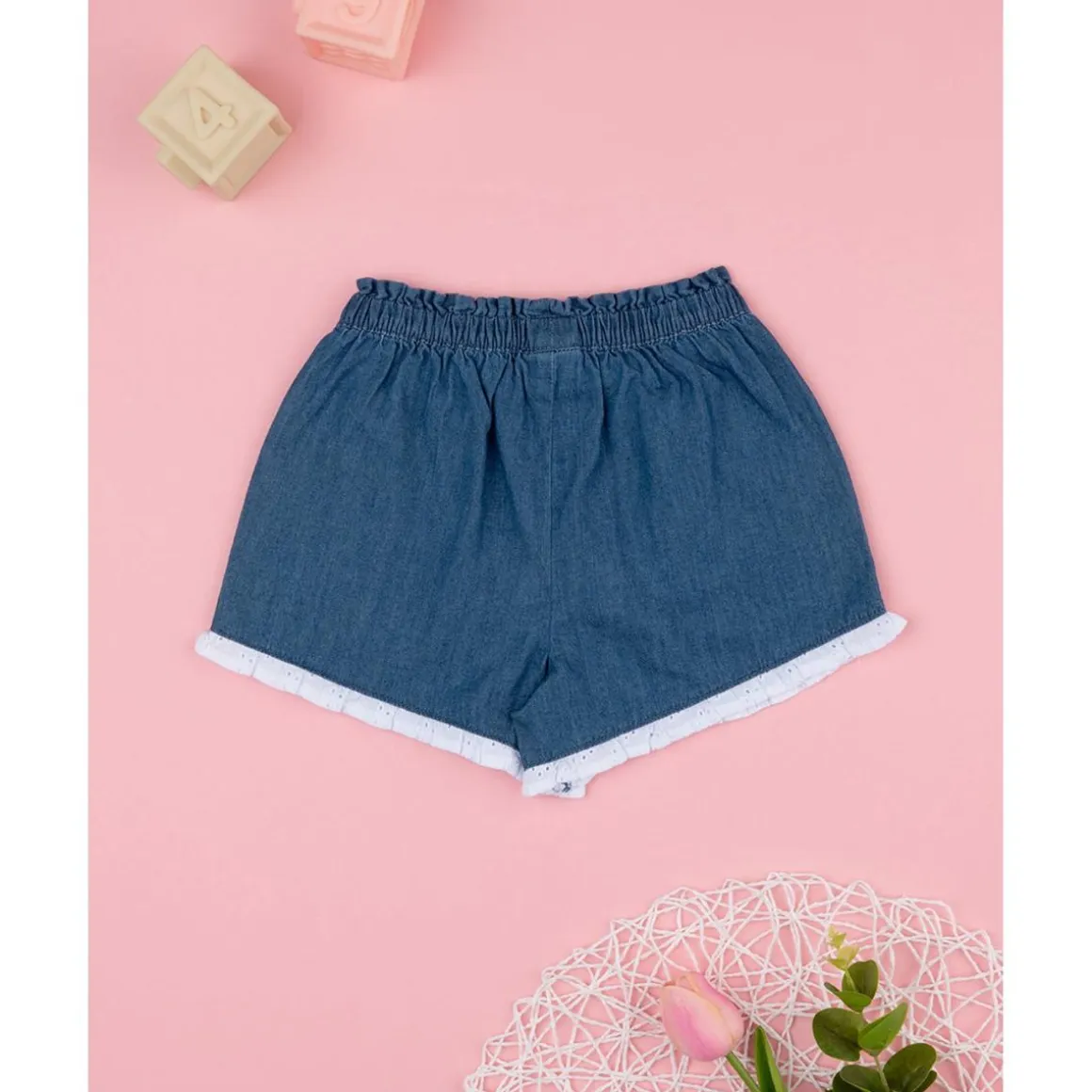 Pantalones cortos casuales de chambray para niña. La prenda se desarrolla en total azul denim con bolsillos de corte transversal y dobladillo en algodón suizo blanco, además de un lazo a juego. El ajuste es holgado y ajustable gracias a un elástico en la cintura. Los pantalones cortos son adecuados para ocasiones casuales y fácilmente combinables. Accesorios no a la venta. El paquete contiene solo la prenda de vestir.