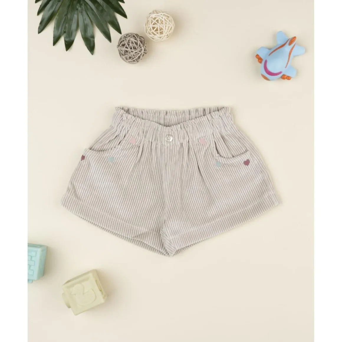 Estos shorts infantiles de pana en tono beige cuentan con bordados en forma de corazones a lo largo de los bolsillos laterales. La cintura elástica garantiza un ajuste cómodo, y un botón de madera frontal aporta un detalle decorativo encantador.