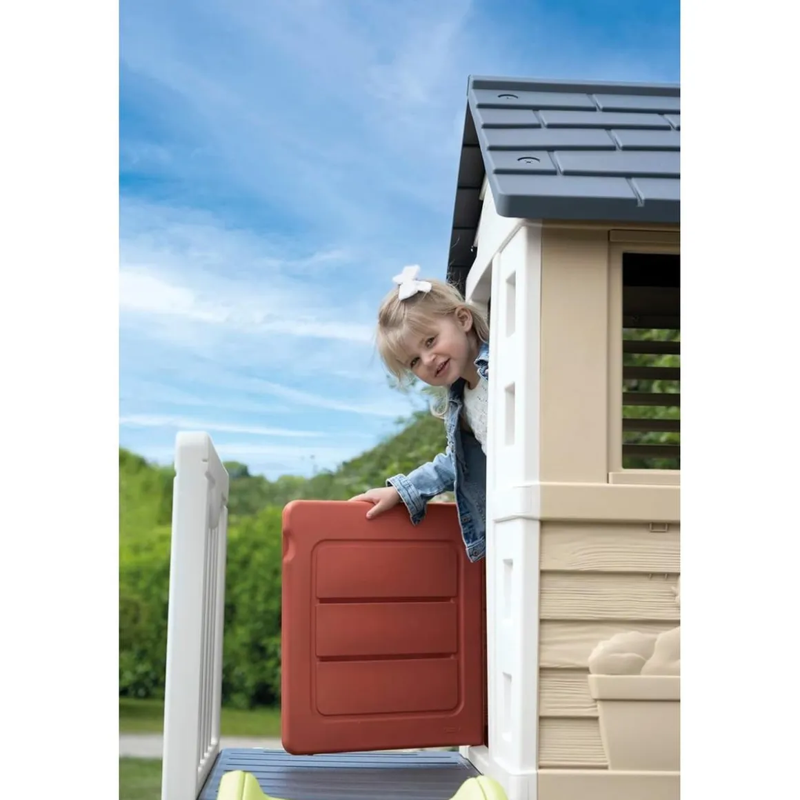Los niños pueden trepar fácilmente a su refugio a través de una escalera, donde podrán observar el entorno gracias a las ventanas con persianas que se abren y cierran. Esta característica no solo proporciona un toque de realismo al jugar, sino que también estimula la creatividad y el juego de roles.