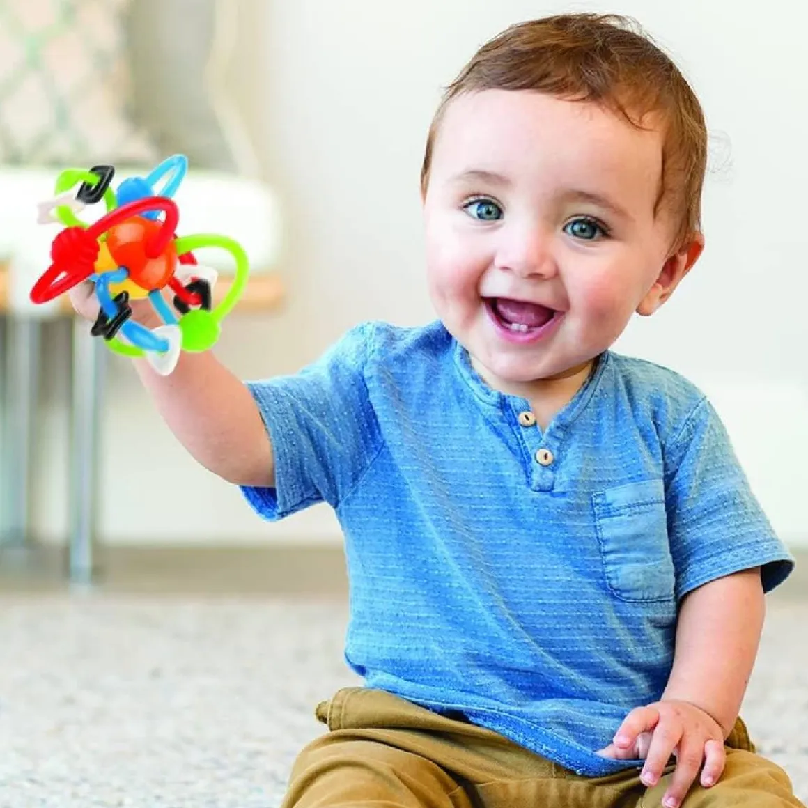 Muy divertido con los loopings, los anillos que chocan y el ruido de las cuentas en la bola central, este sonajero es ideal para despertar los sentidos del bebé.