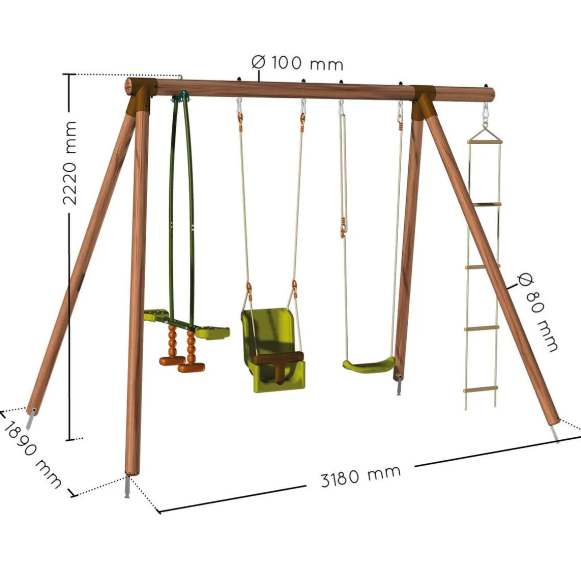 Se trata de un columpio de madera tratada con autoclave IV marrón. Es ideal para una casa con jardín, y para peques de 3 a 12 años.