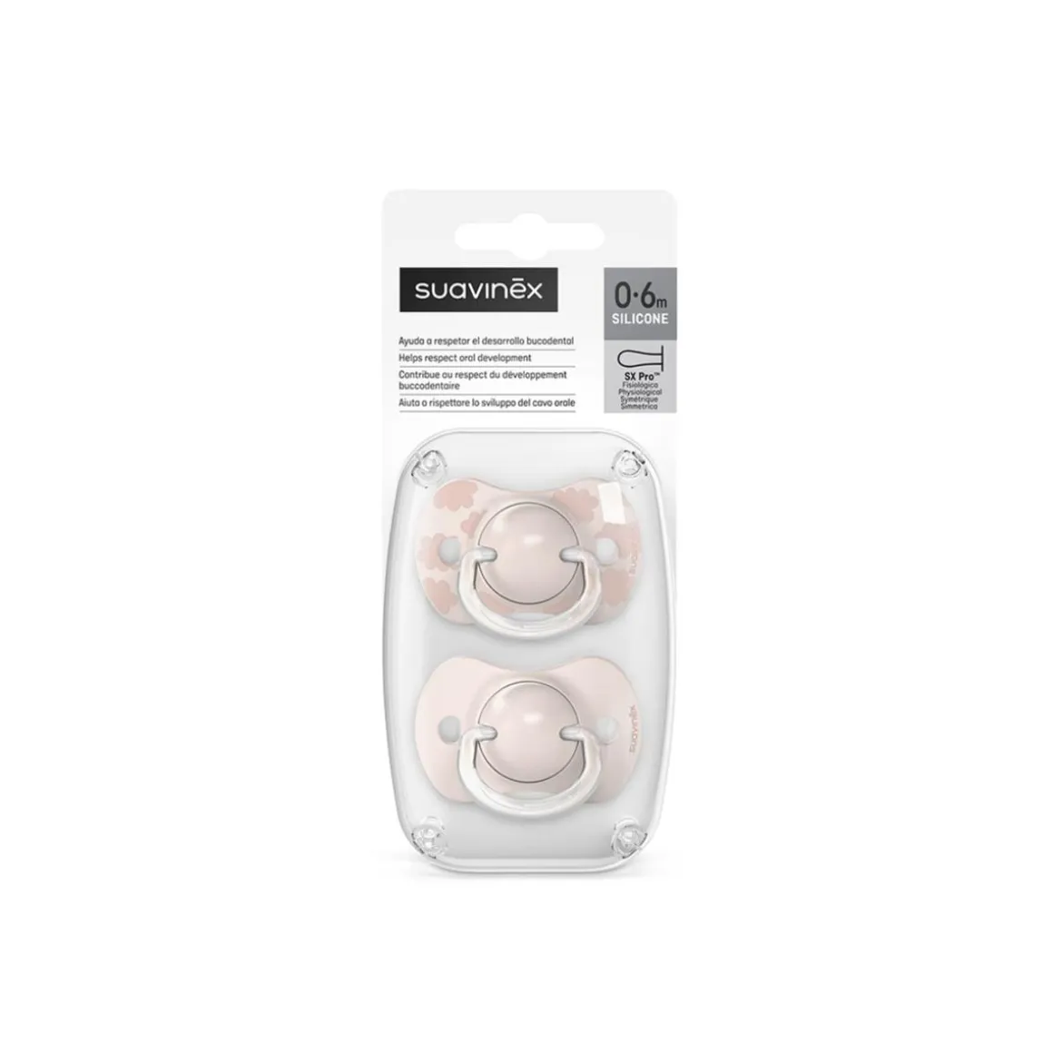 Suavinex – Set de 2 chupetes silicona 0-6 meses SX Pro Rosa. Pack de 2 chupetes con tetina simétrica de silicona SX Pro, para bebés de 0/6 meses.