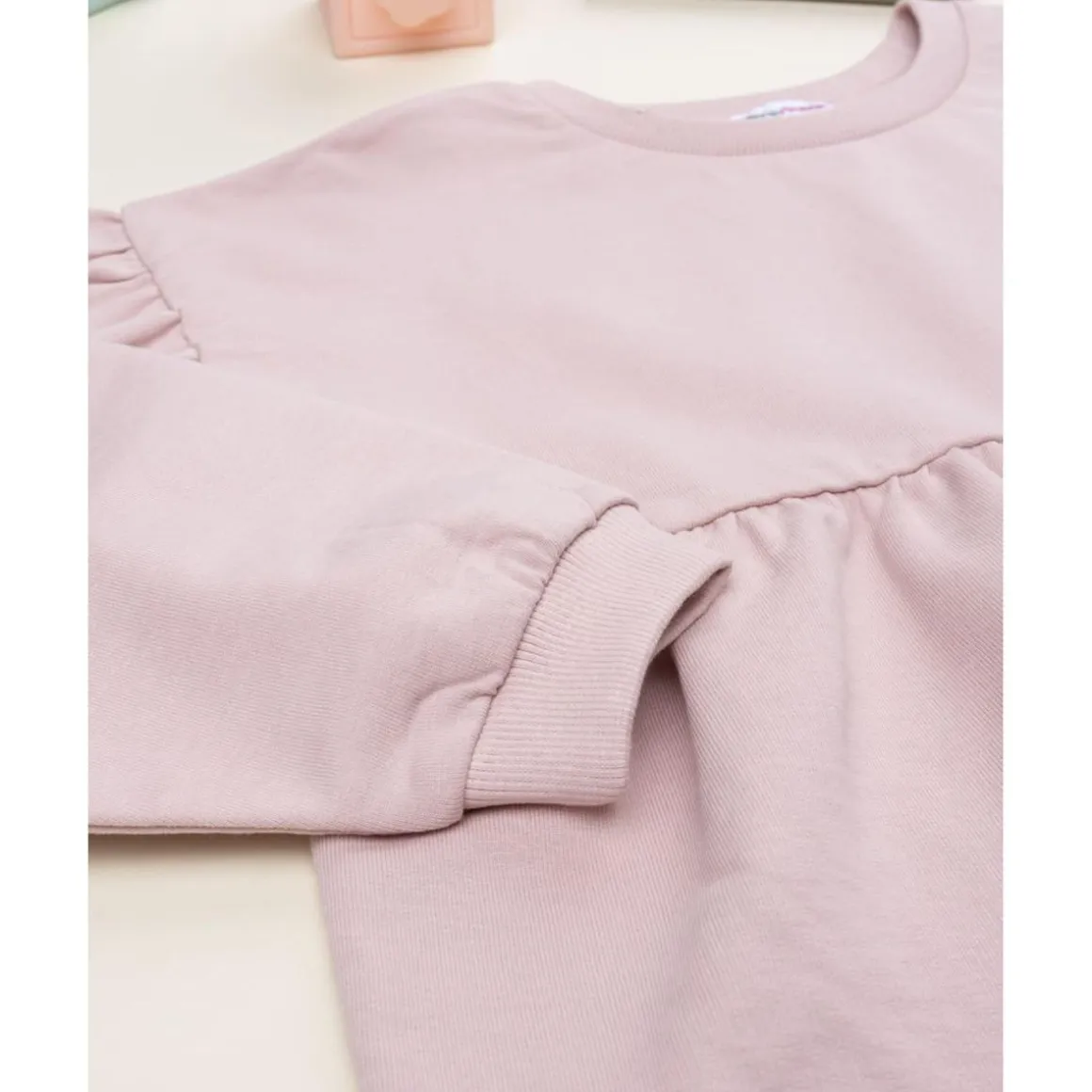 Bonita sudadera con interior afelpado para niña en rosa antiguo con delicados volantes a tono. Suave, cómoda y perfecta para looks tiernos y casuales.