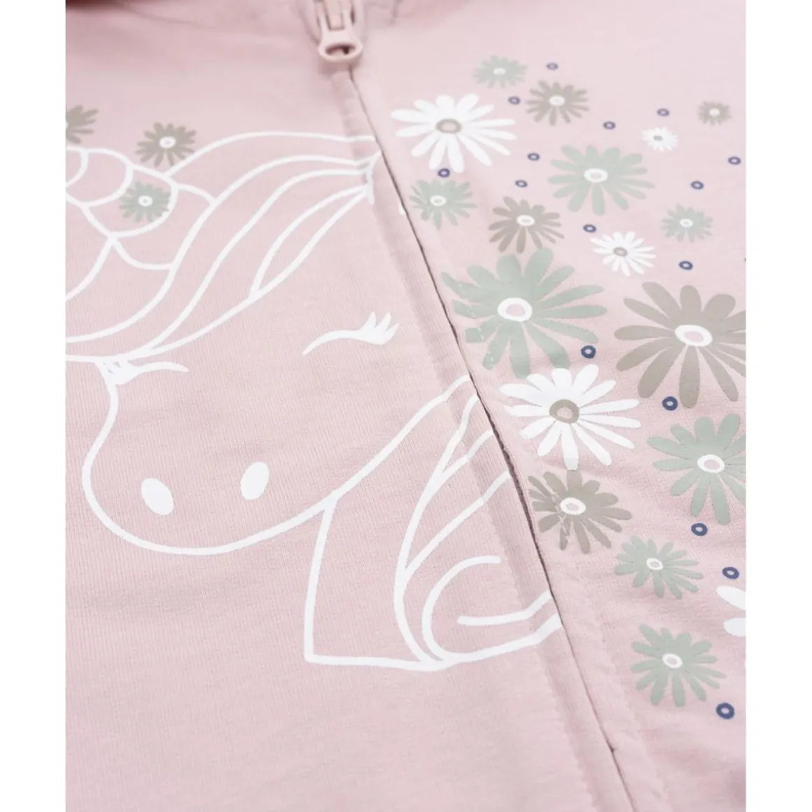 Sudadera con capucha en color rosa y estampado de unicornio, pensada para aportar diversión y comodidad al vestuario infantil. Su cierre frontal con cremallera facilita la colocación.