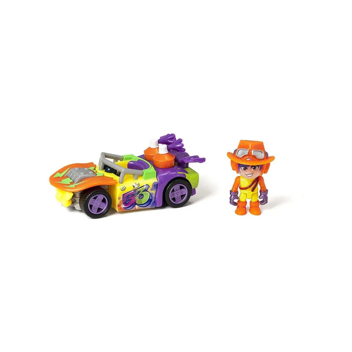 T-Racers – Wheel Box serie 2, un set T Racers (varios modelos), un playset T-Racers con un piloto, cabina, parte frontal, parte trasera y 4 ruedas.