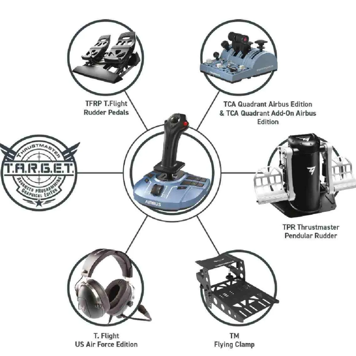 - Compatible con TCA Quadrant Airbus Edition (con o sin add-on), Thrustmaster T.Flight Rudder Pedals (TFRP) y TM Flying Clamp (todos vendidos por separado) tanto en Xbox como en PC