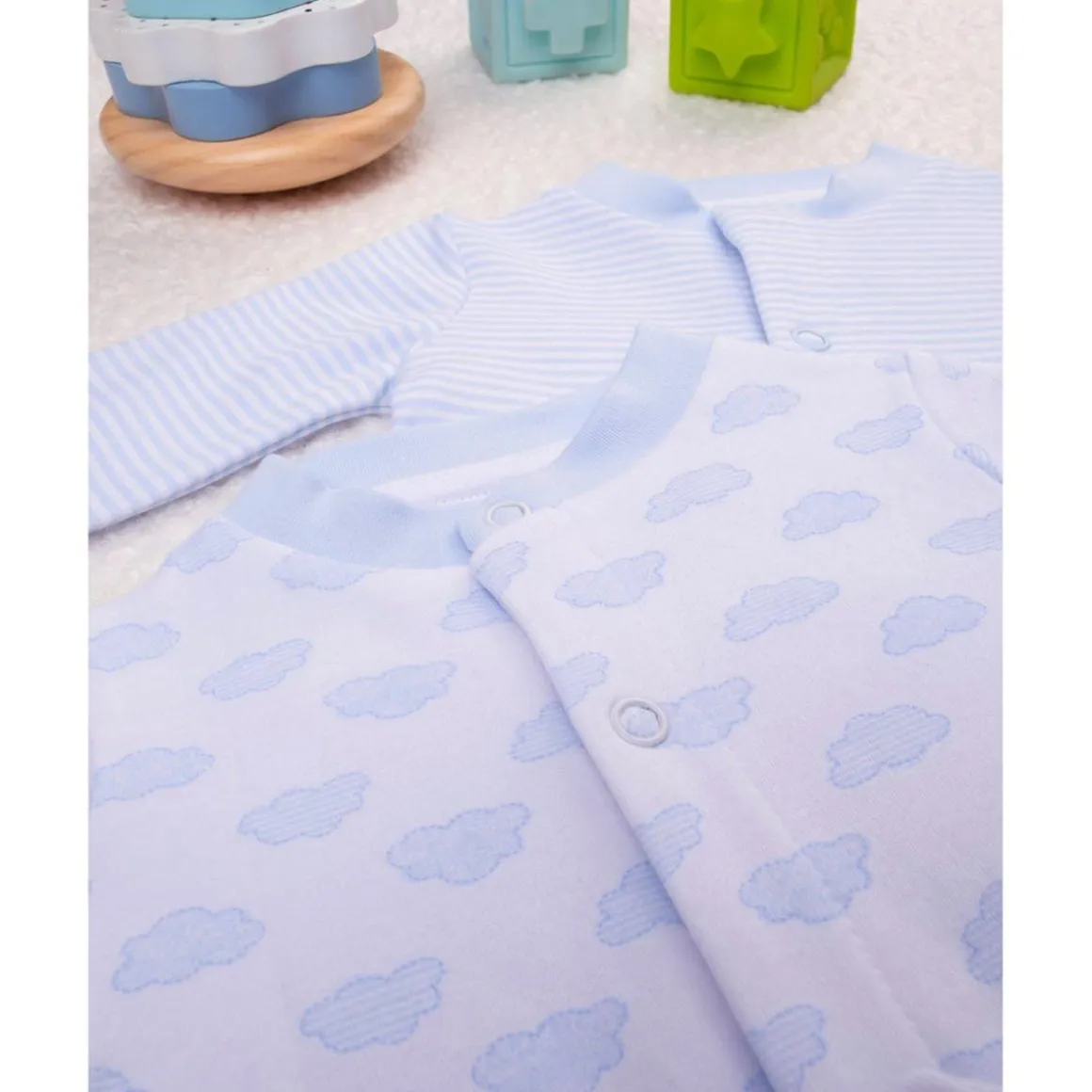 Conjunto compuesto por tres peleles de interlock de manga larga con automáticos en la entrepierna. Un pelele es color crema con un estampado completo de nubes azules y automáticos en la parte delantera, otro es de rayas azules y blancas con automáticos en la parte delantera. El tercer pelele es azul con dos nubecitas estampadas en la parte delantera con un cuello blanco y automáticos en la parte posterior. Accesorios no a la venta. El paquete contiene solo la prenda de vestir.
