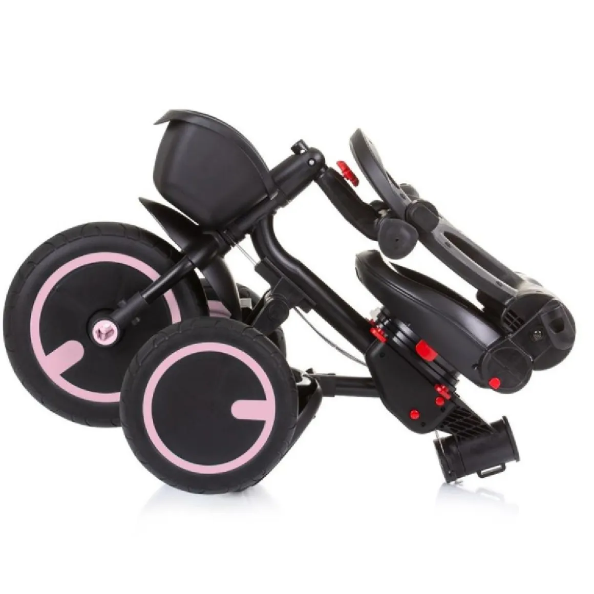 Y cuando llegue el momento de guardar el triciclo, su diseño plegable y desmontable permite un almacenamiento compacto y sencillo, en rápidos y sencillos «clics» en el mango de empuje, la rueda delantera y el manillar.