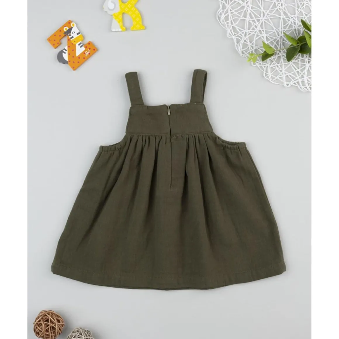El vestido pichi verde con bordado es una prenda versátil y cómoda, ideal para los looks diarios o más cuidados. Confeccionado en twill de algodón, combina suavidad y resistencia. Su diseño con tirantes finos y cremallera trasera permite un ajuste práctico, mientras el bordado en tono coordinado añade un detalle delicado y elegante.